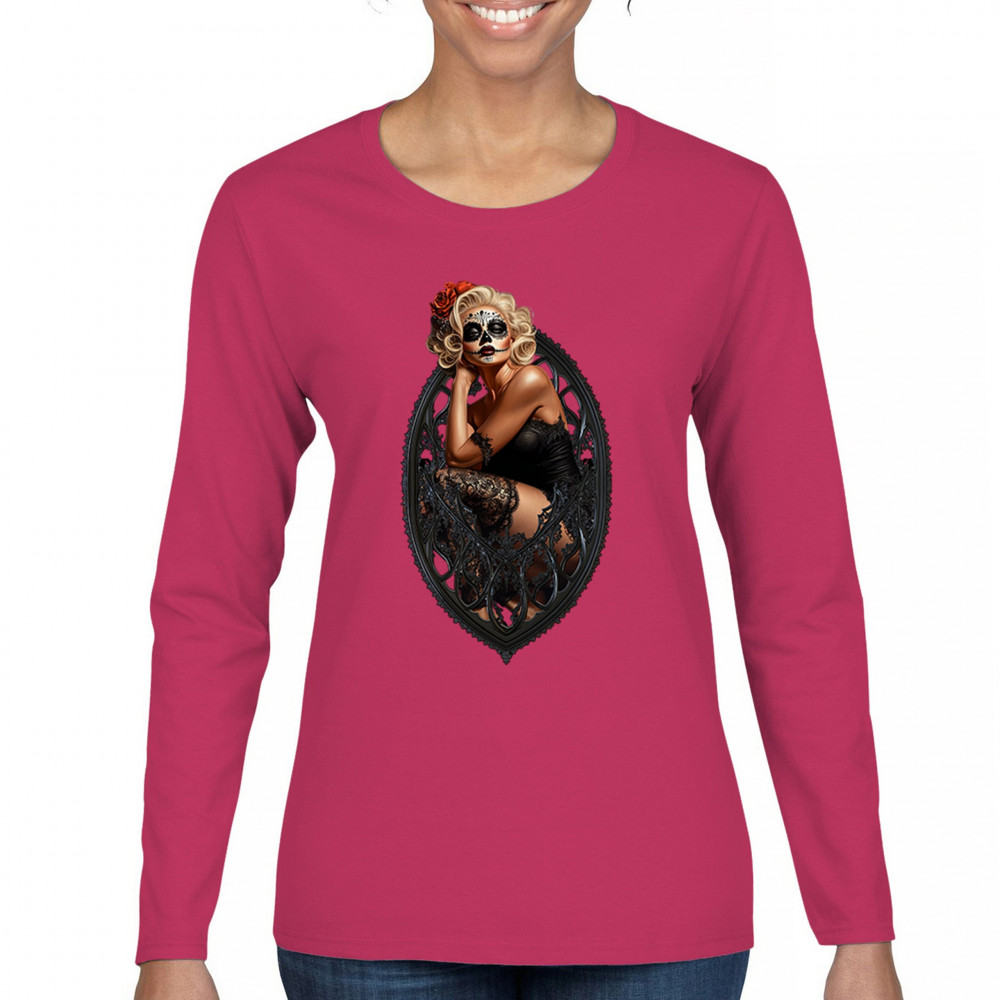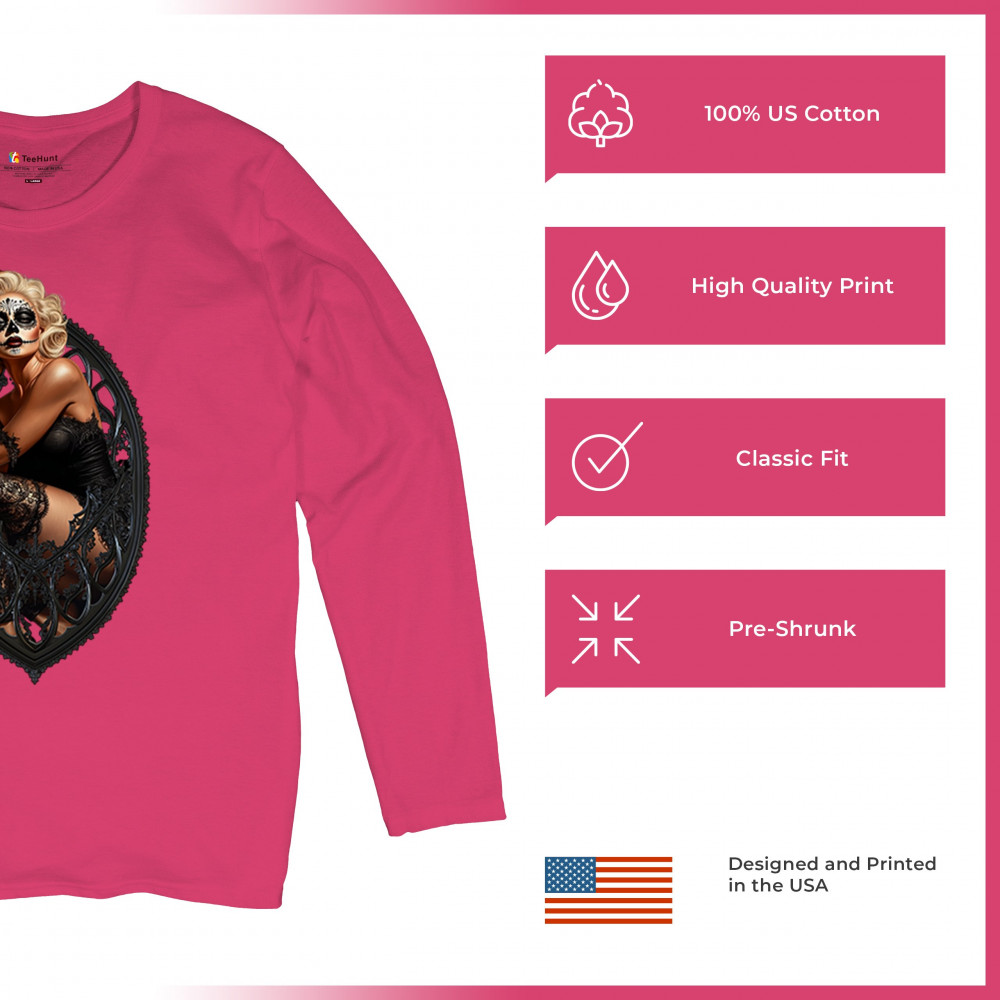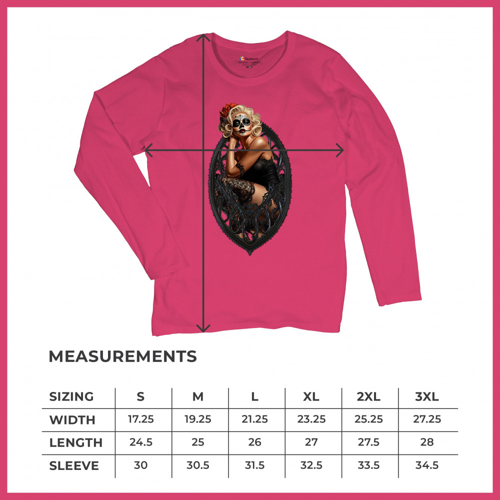This sultry sugar skull pinup design blends gothic lace, seductive pose, and ornate frame detail for a bold Day of the Dead tribute. With striking makeup and vintage lingerie styling, it’s perfect for fans of macabre fashion, calavera art, and dark romance. A hauntingly beautiful mix of allure, attitude, and Dia de los Muertos charm.