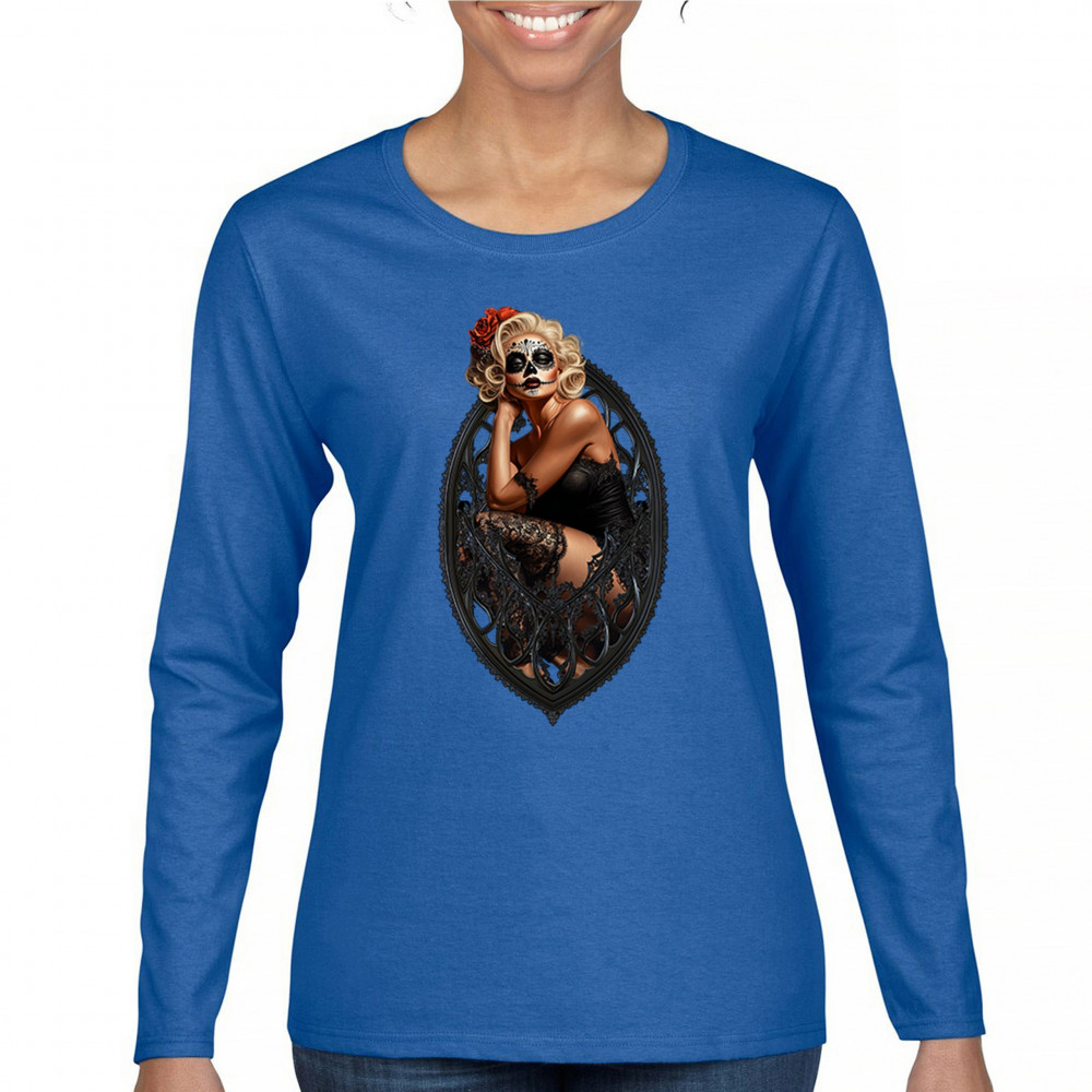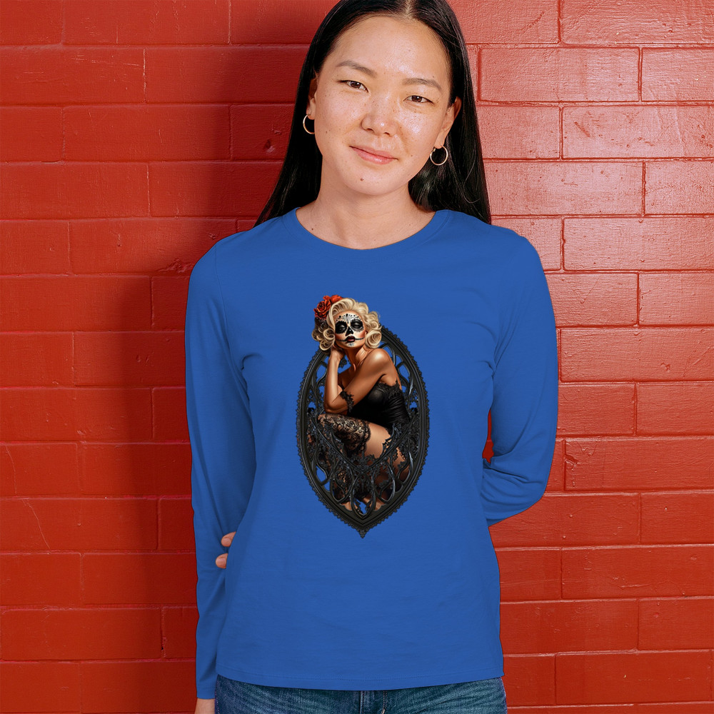 This sultry sugar skull pinup design blends gothic lace, seductive pose, and ornate frame detail for a bold Day of the Dead tribute. With striking makeup and vintage lingerie styling, it’s perfect for fans of macabre fashion, calavera art, and dark romance. A hauntingly beautiful mix of allure, attitude, and Dia de los Muertos charm.
