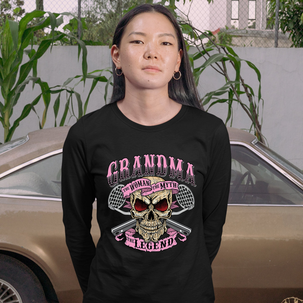 A funny print featuring a skull with two potato mashers behind it. The print says: "Grandma the Woman the Myth the Legend". A great choice as a gift on Mother's Day for a loving caring grandmother.