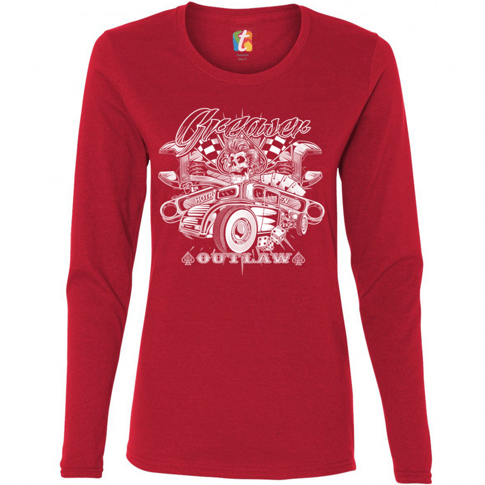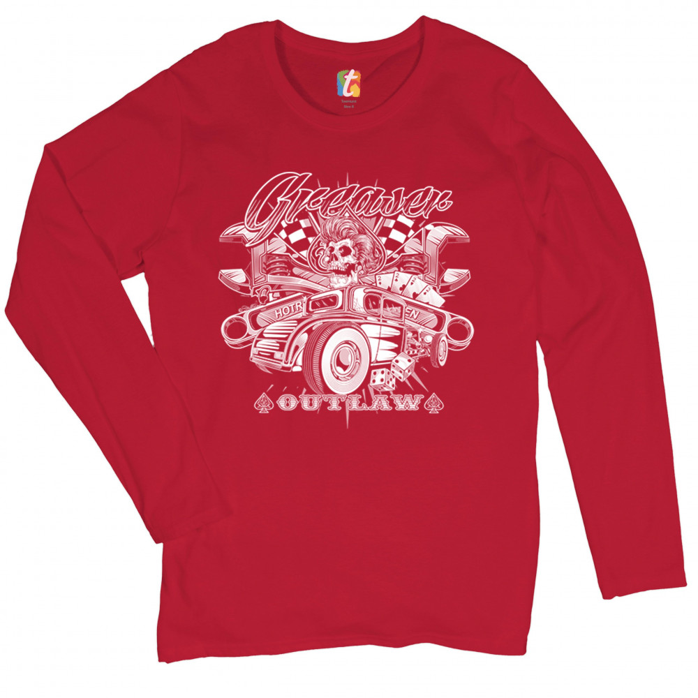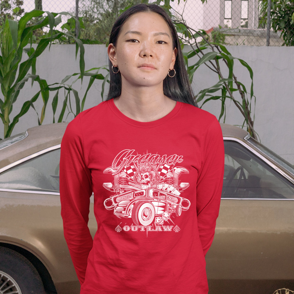 A print featuring a skull, a vintage Hot Rod and a pair of dice. In the background there are crossed wrenches, playing cards and racing flags. The print says: "Greaser outlaw". A great choice for a fan of customized American classic cars and hot rods.