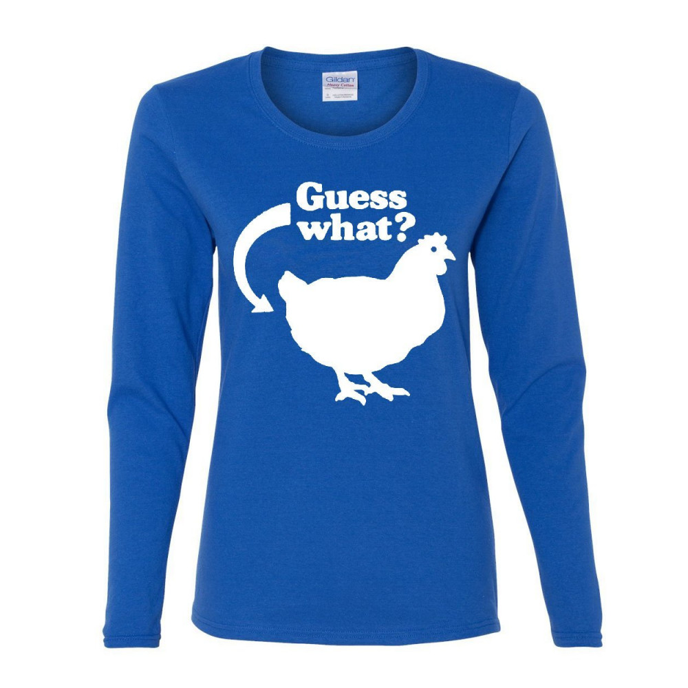 GUESS WHAT? CHICKEN BUTT women's long sleeve tee funny ironic offensive humor royal blue
