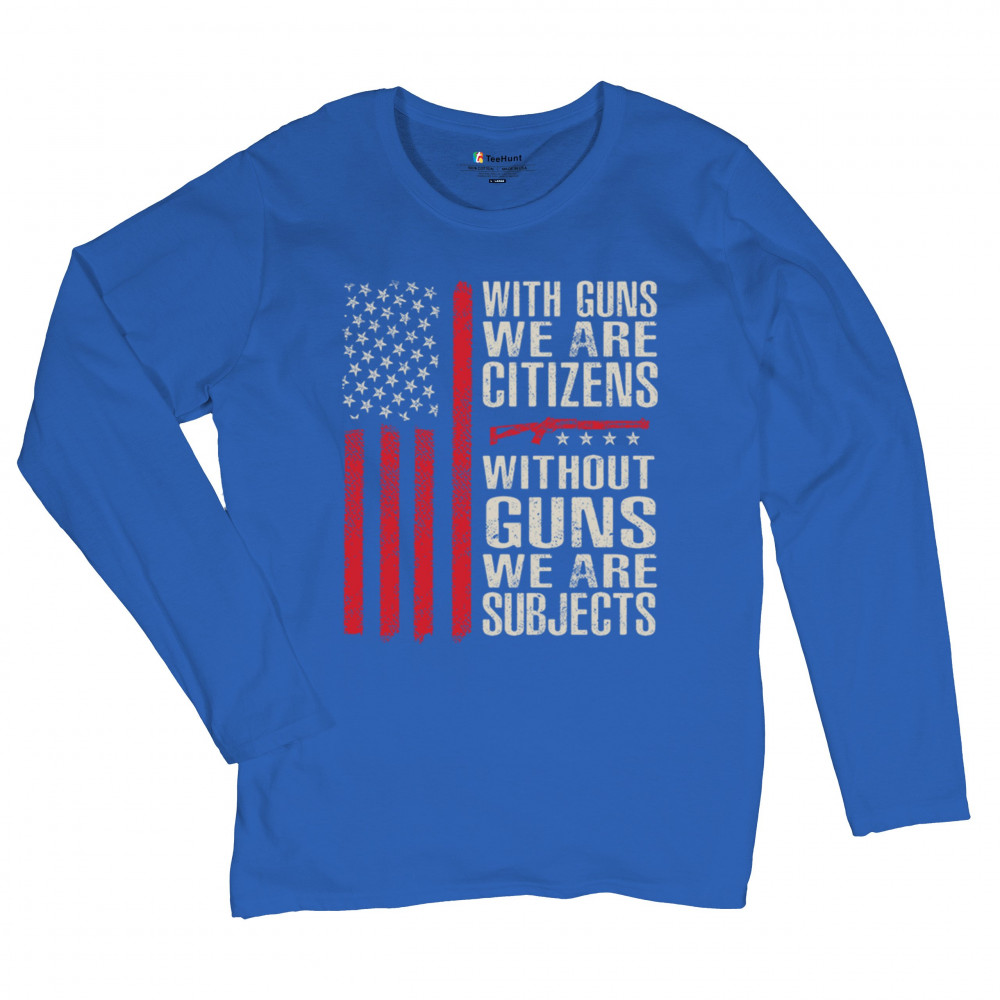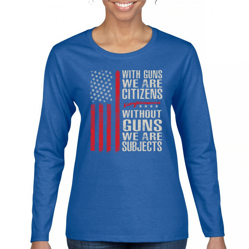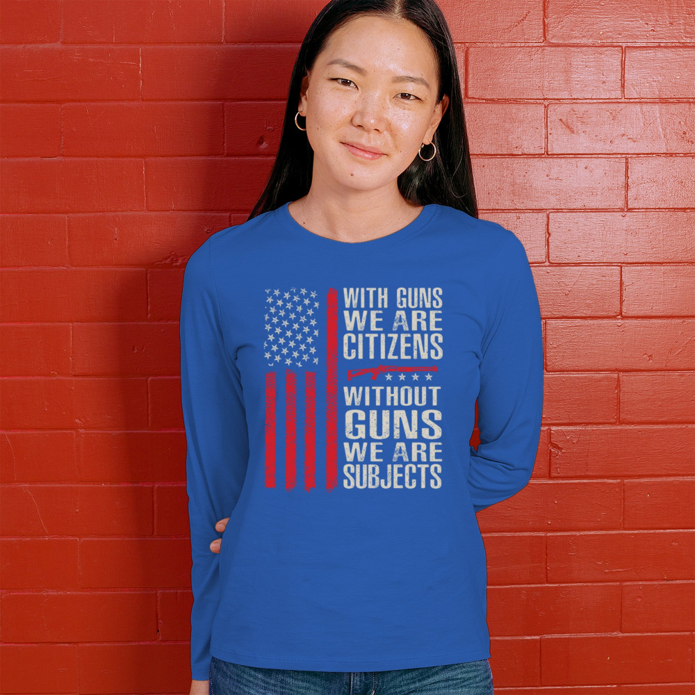 Make your voice heard with this powerful pro-2A design featuring an AR-15 graphic and distressed red American flag. The quote “With Guns We Are Citizens, Without Guns We Are Subjects†speaks directly to the heart of liberty and personal defense. A must-have for patriots, protestors, and gun rights supporters who defend the Constitution.