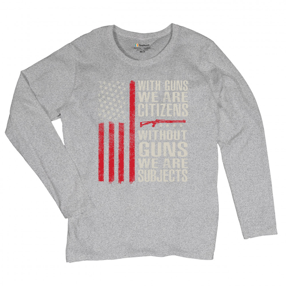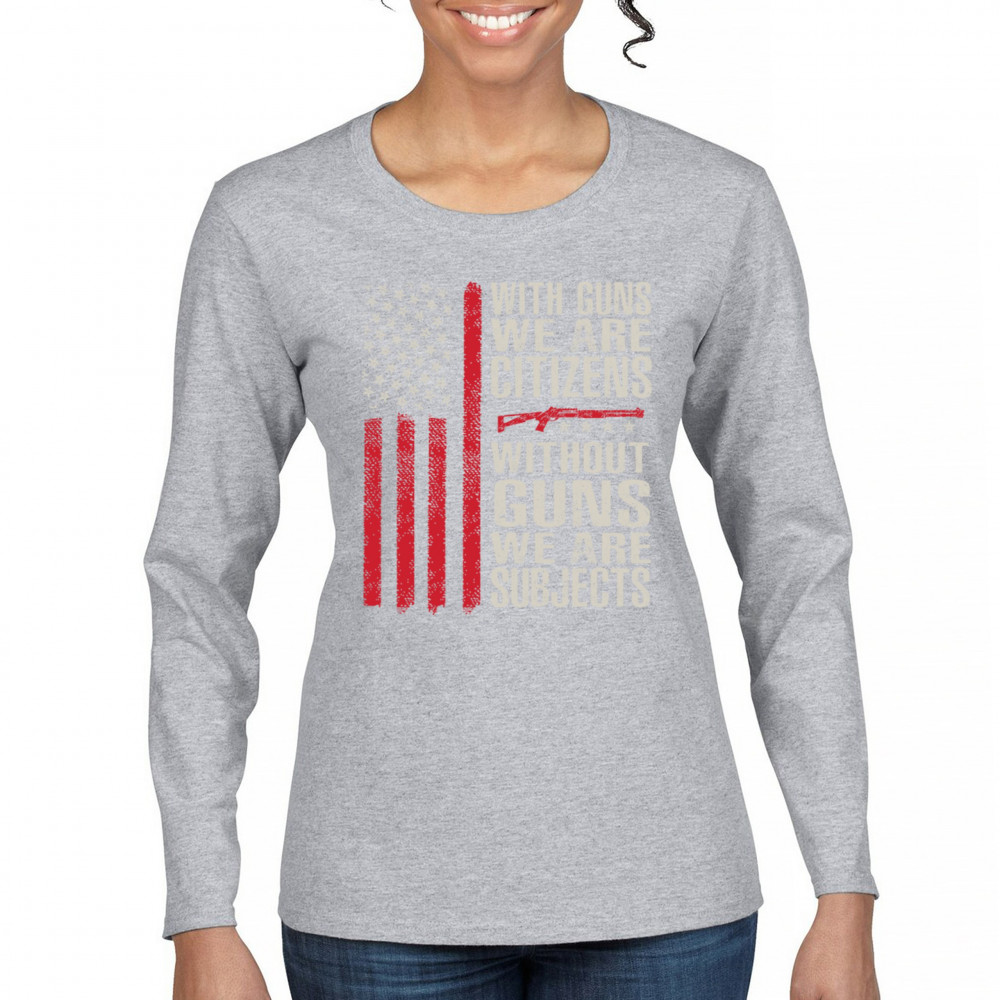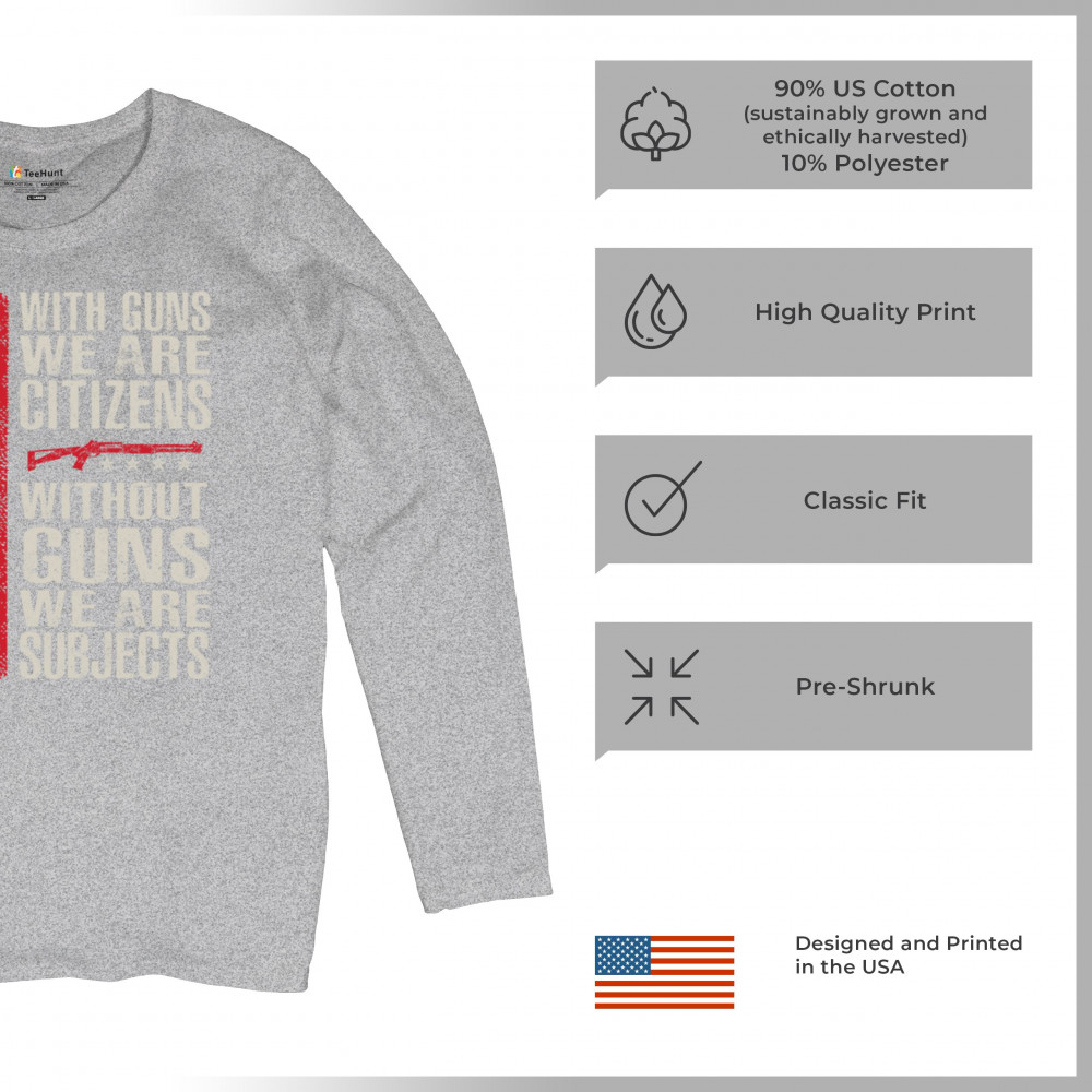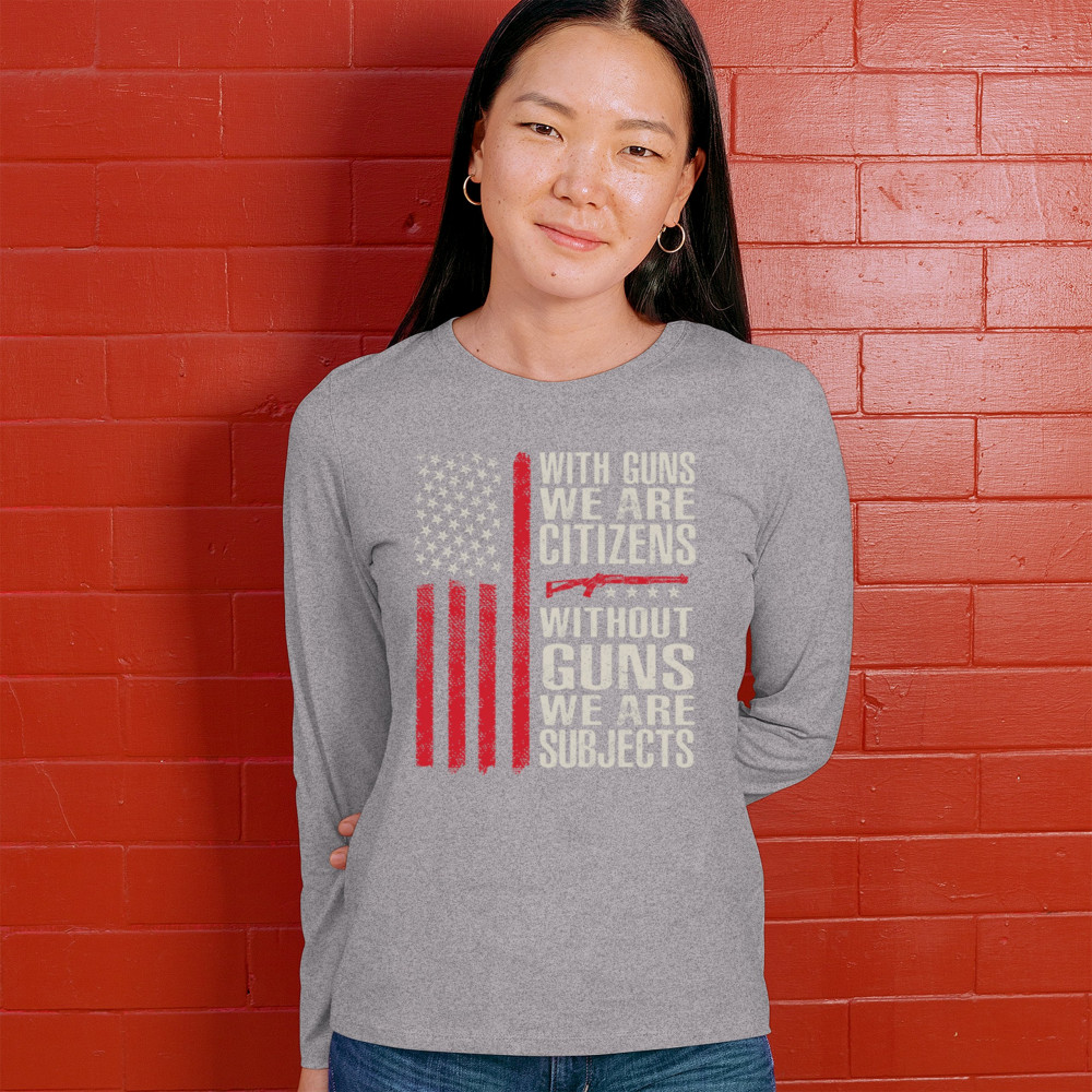 Make your voice heard with this powerful pro-2A design featuring an AR-15 graphic and distressed red American flag. The quote “With Guns We Are Citizens, Without Guns We Are Subjects†speaks directly to the heart of liberty and personal defense. A must-have for patriots, protestors, and gun rights supporters who defend the Constitution.