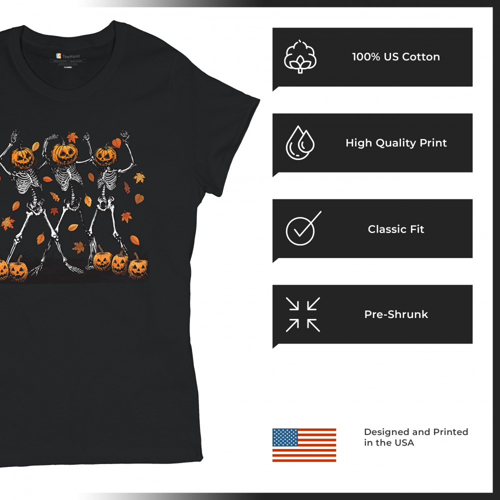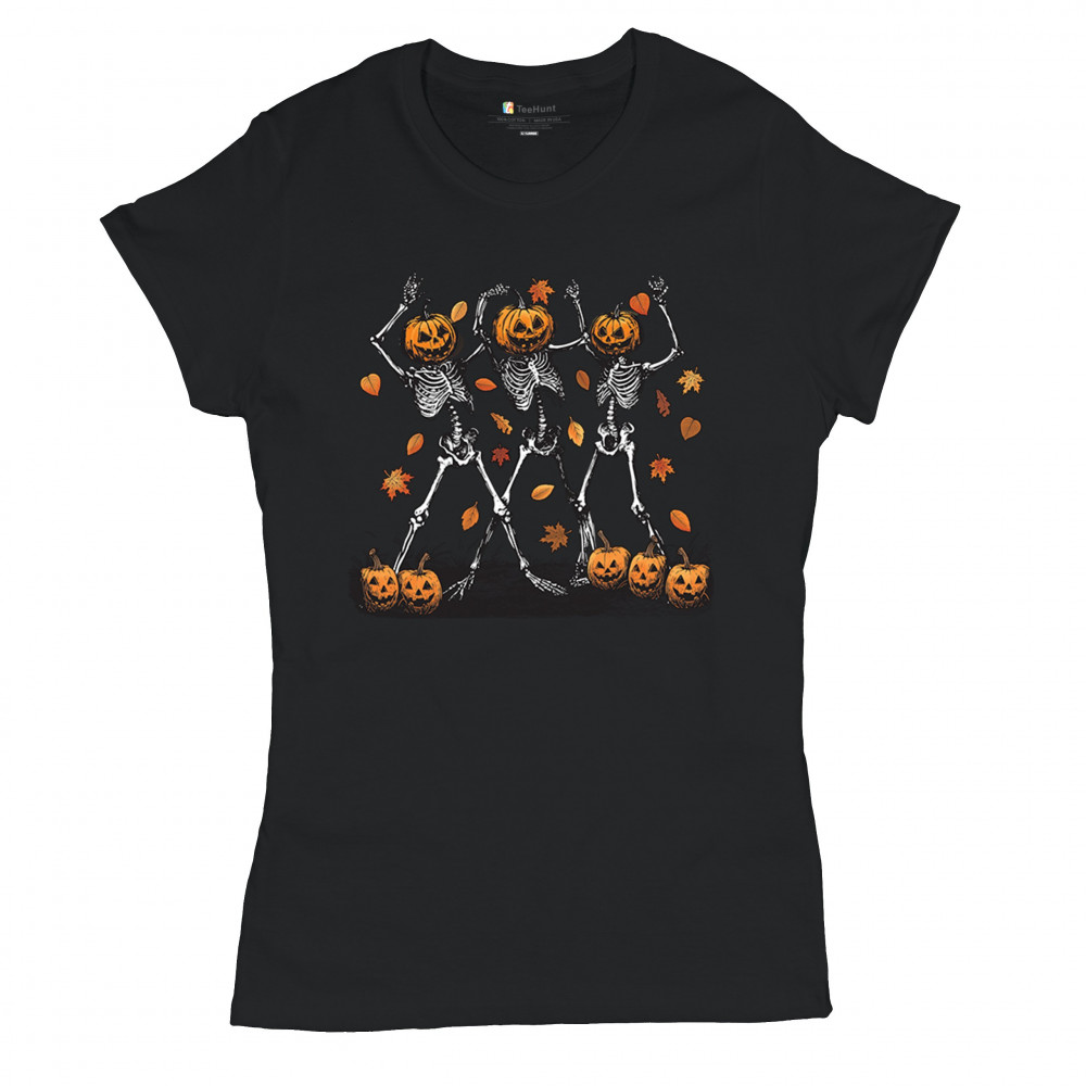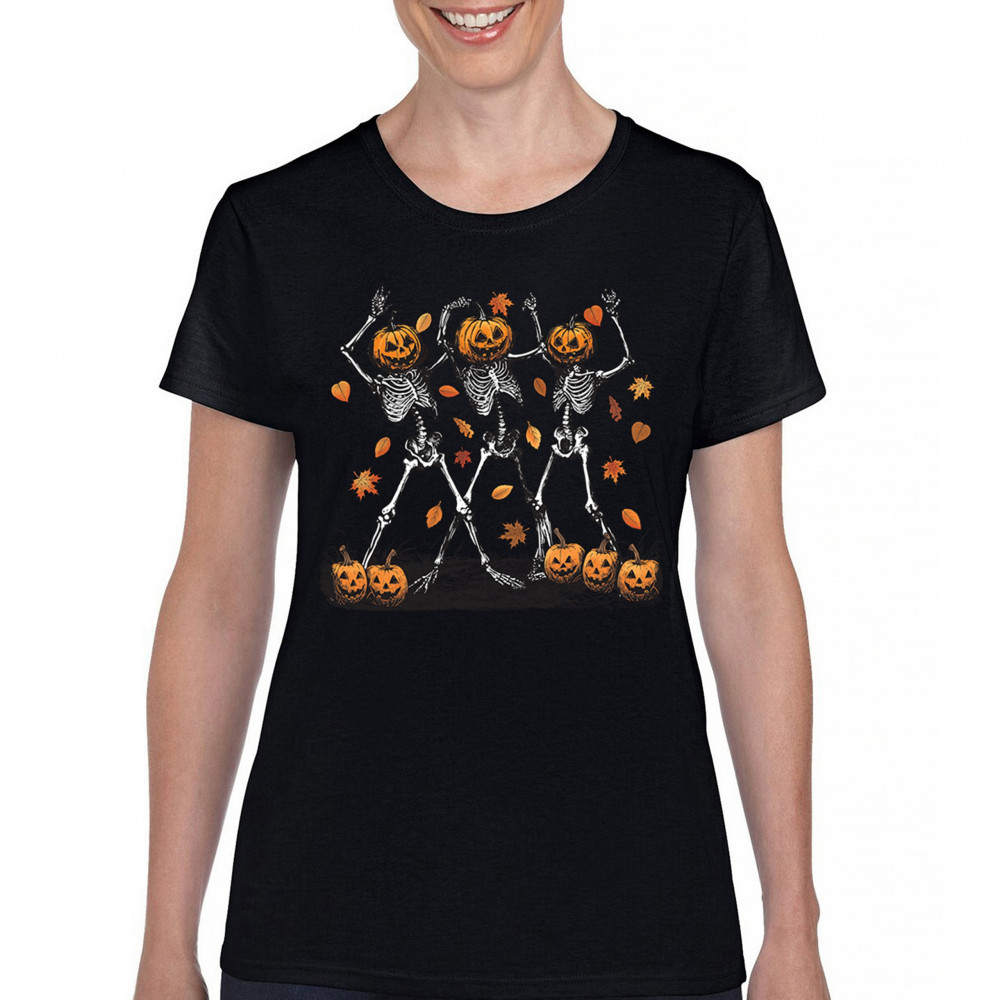HALLOWEEN SKELETONS JACK-O-LANTERN DANCE t-shirt fun pumpkin skull women's tee black