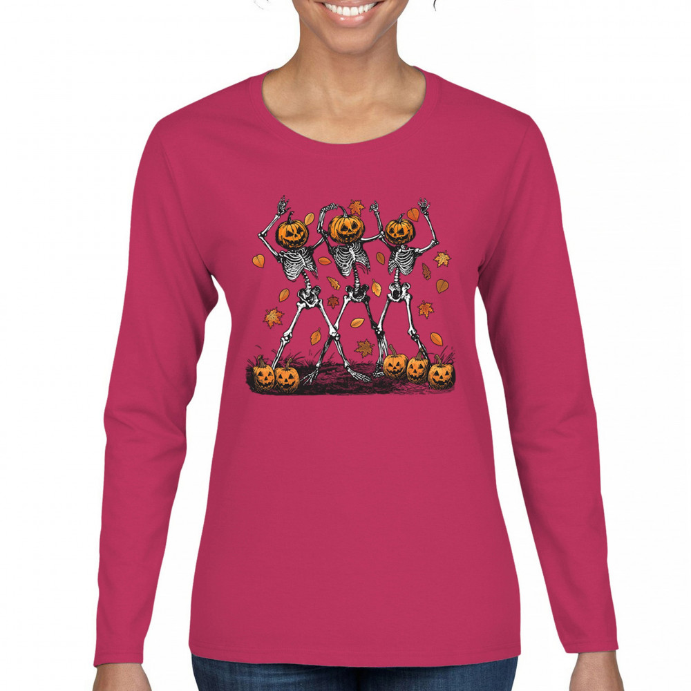 Add a touch of spooky fun to your wardrobe with this lively design featuring pumpkin-headed skeletons dancing through a swirl of autumn leaves. Perfect for Halloween parties, trick-or-treating, and fall festivals, this design is a must-have for anyone who enjoys the whimsical side of the spooky season. Made with comfort and quality in mind, this is the perfect apparel for all your October gatherings and events. Wear it to show off your Halloween spirit!