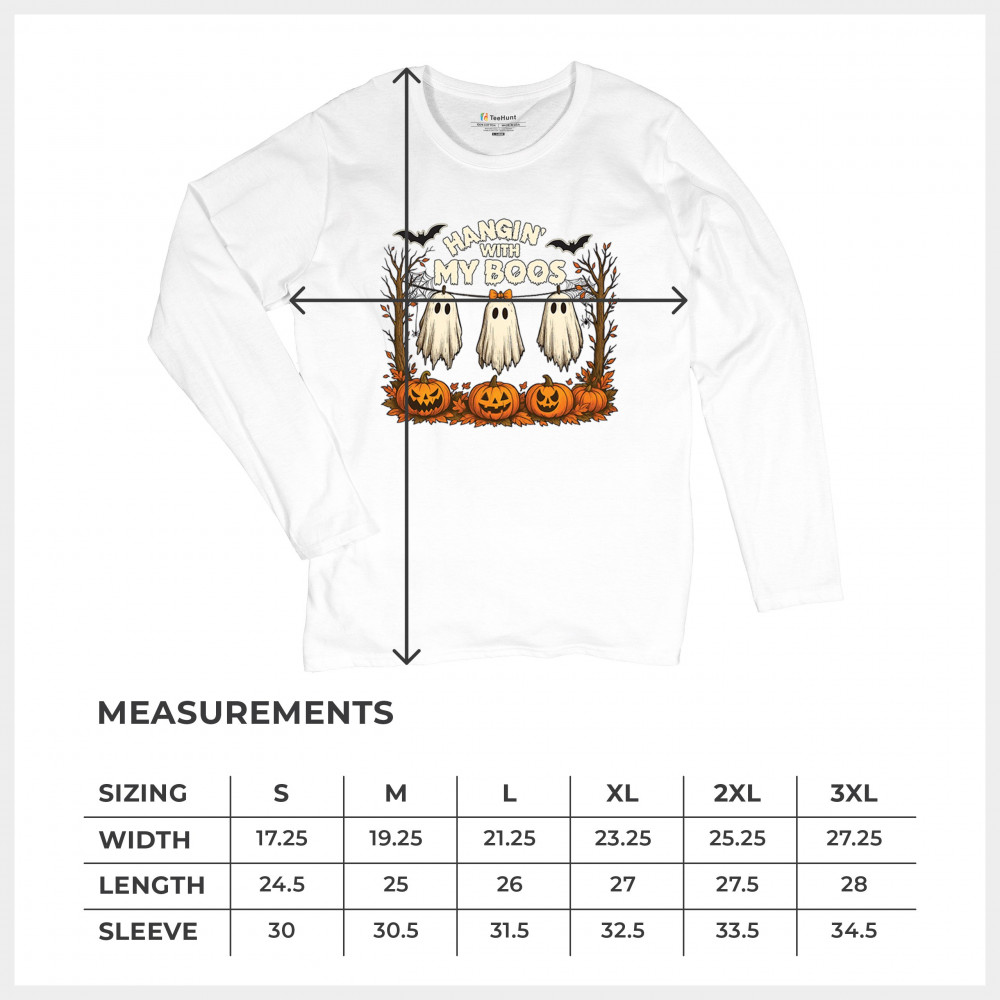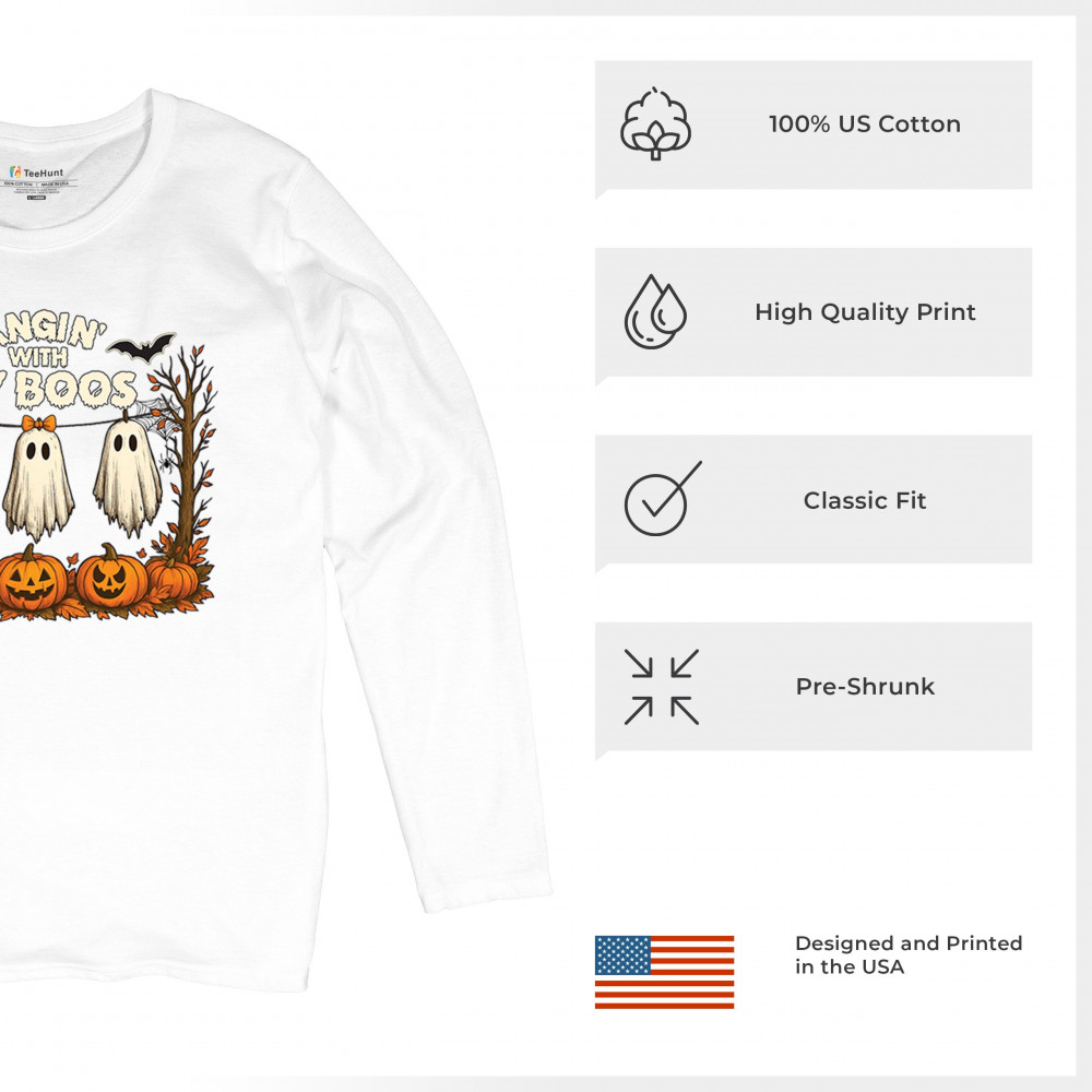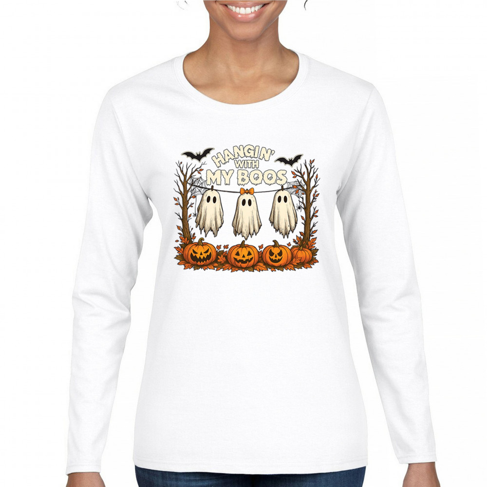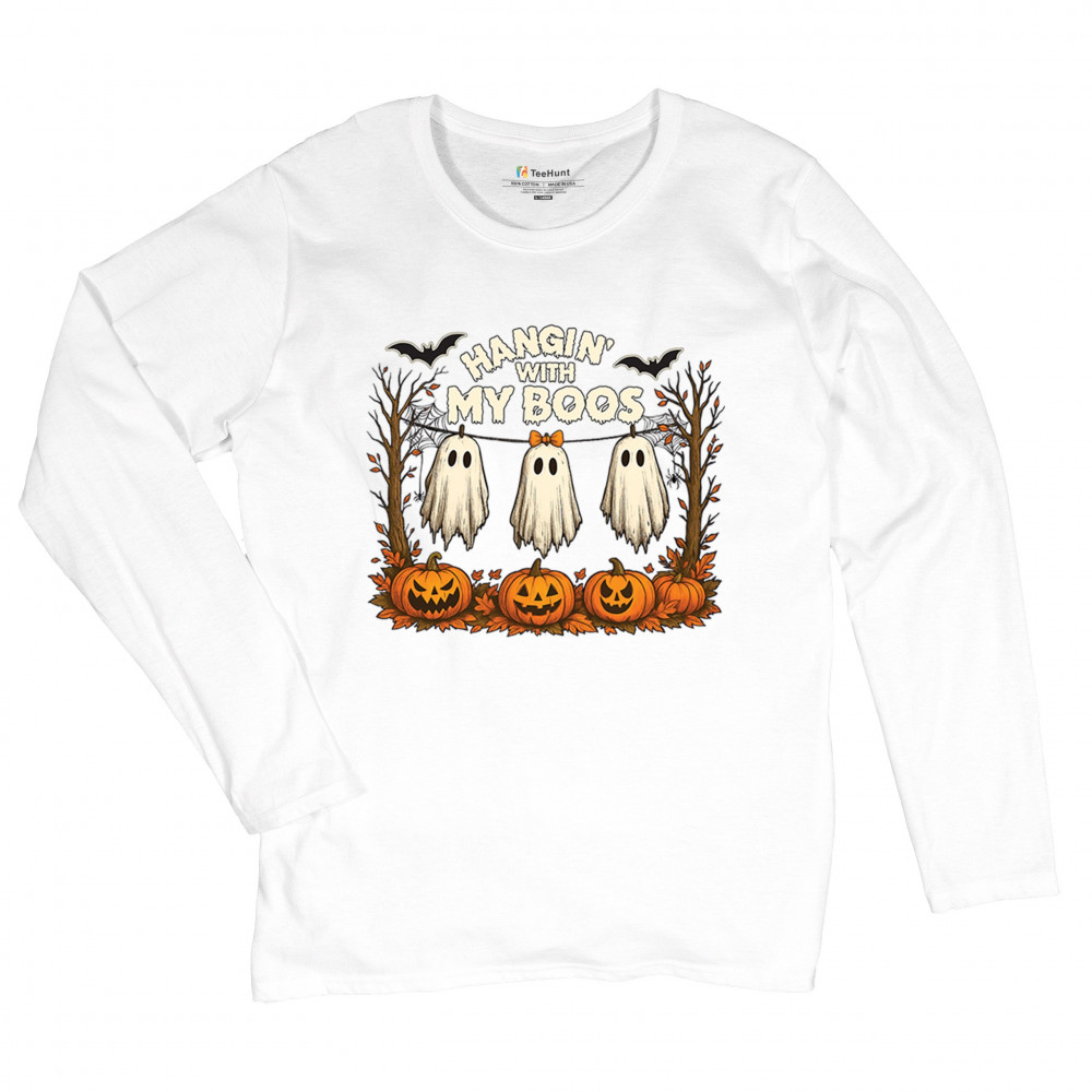 Hangin With My Boos design featuring spooky ghosts, jack o lanterns, and haunted house humor. Perfect for Halloween night, October 31, and parties.