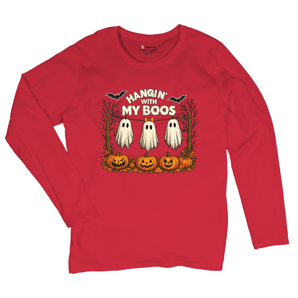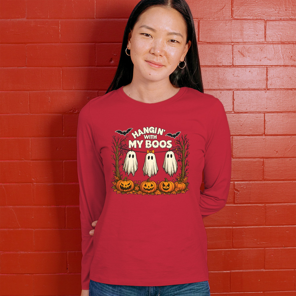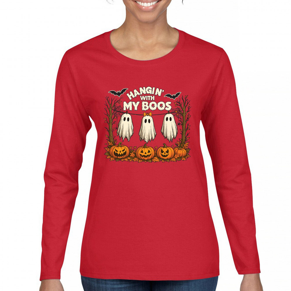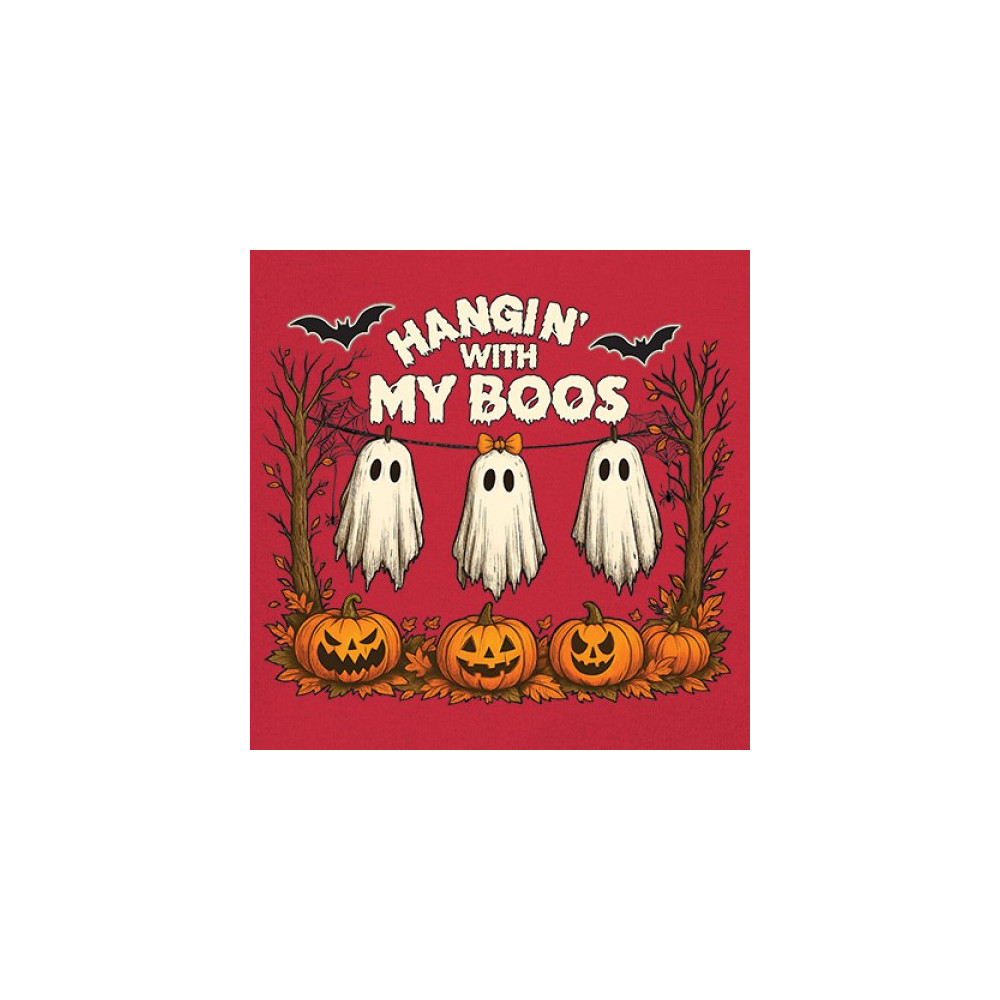 Hangin With My Boos design featuring spooky ghosts, jack o lanterns, and haunted house humor. Perfect for Halloween night, October 31, and parties.