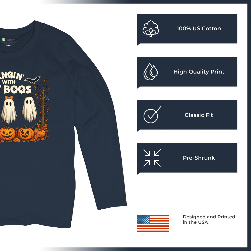 Hangin With My Boos design featuring spooky ghosts, jack o lanterns, and haunted house humor. Perfect for Halloween night, October 31, and parties.
