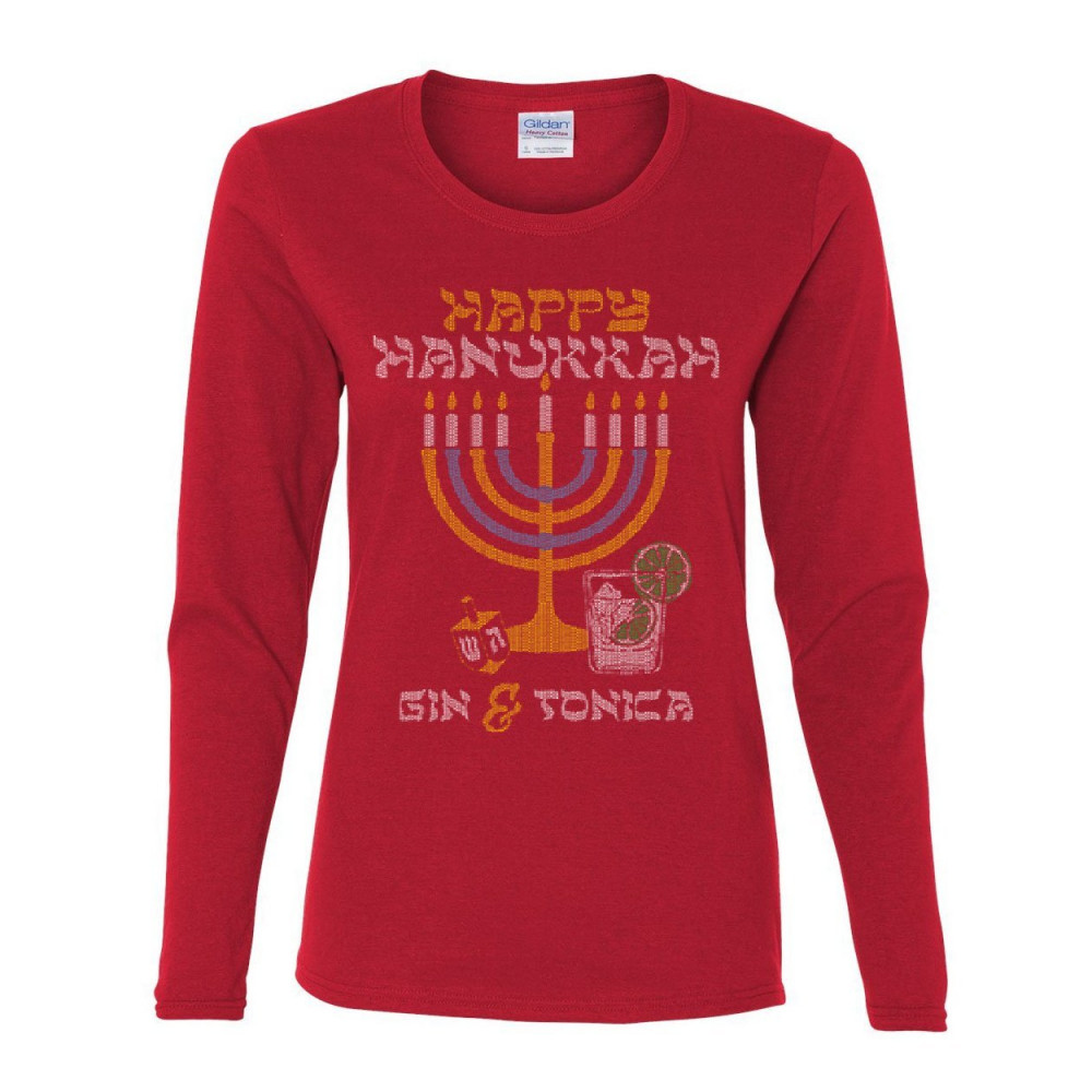 HAPPY HANUKKAH GIN & TONICA happy hanukkah women's long sleeve tee menorah drinking gin & tonica dreidel red