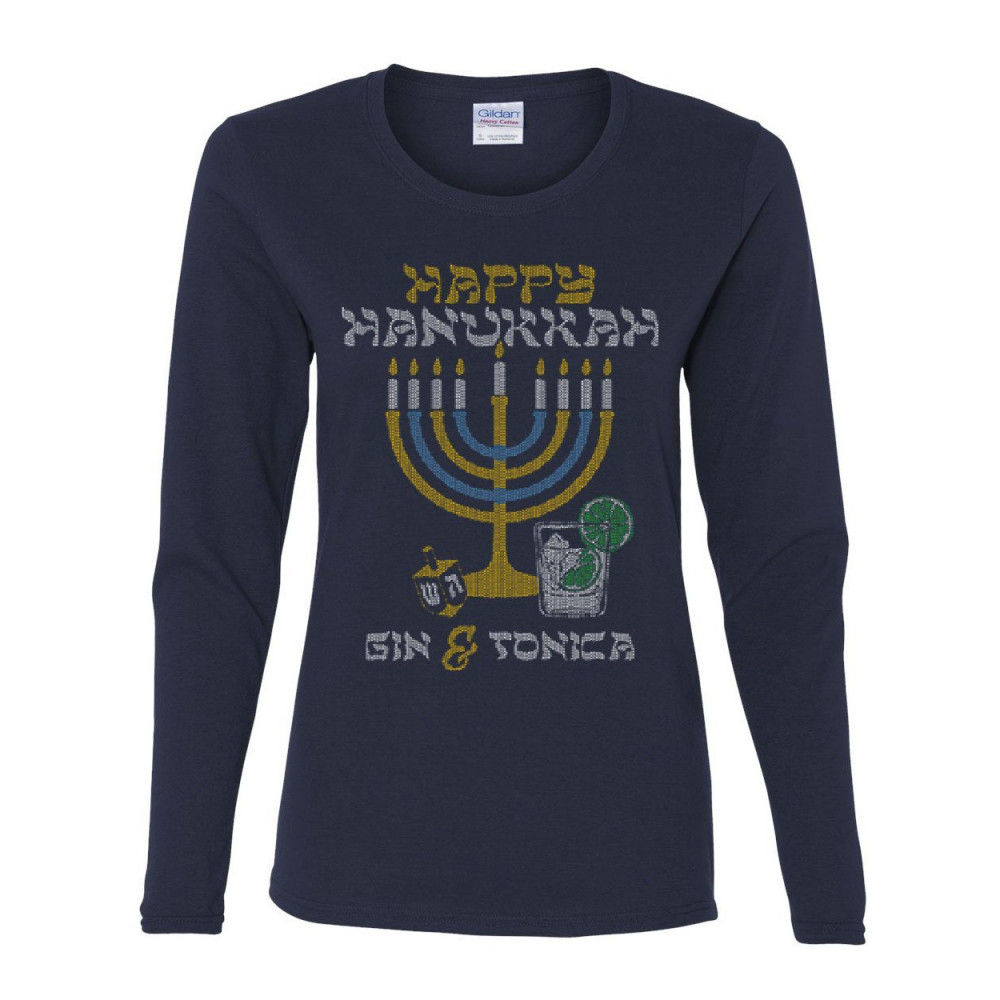 HAPPY HANUKKAH GIN & TONICA happy hanukkah women's long sleeve tee menorah drinking gin & tonica dreidel navy blue