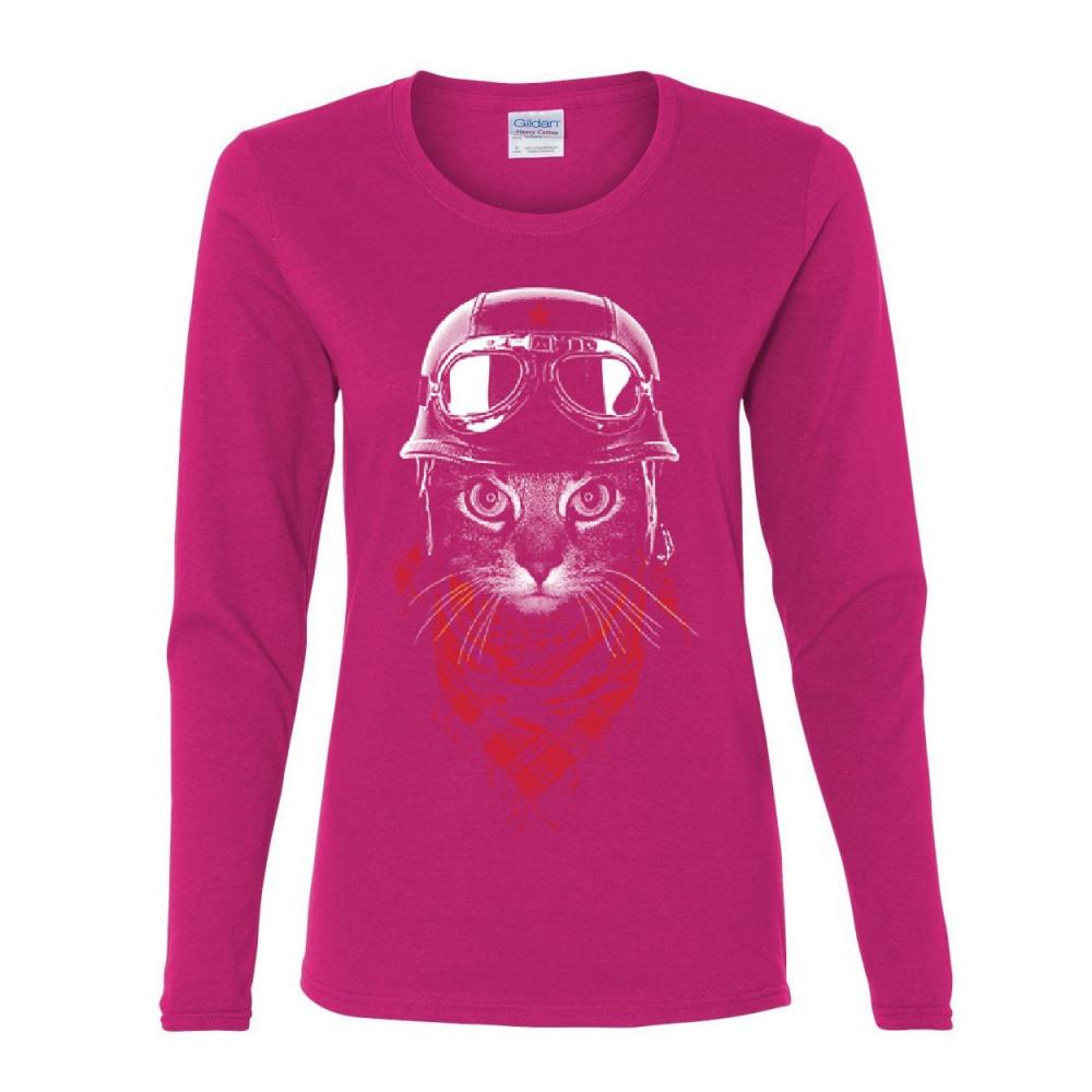 HARDCORE BIKER CAT women's long sleeve tee adventurer motorcycle rider kitten pink