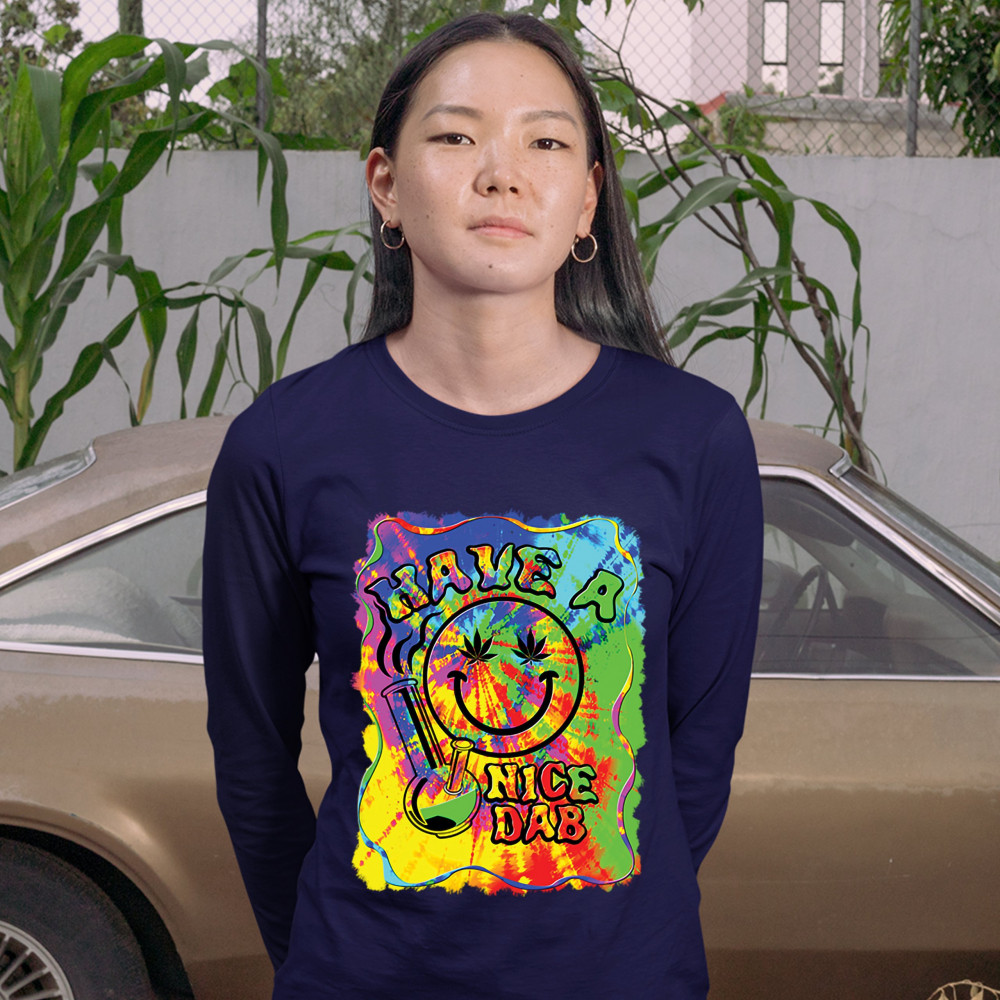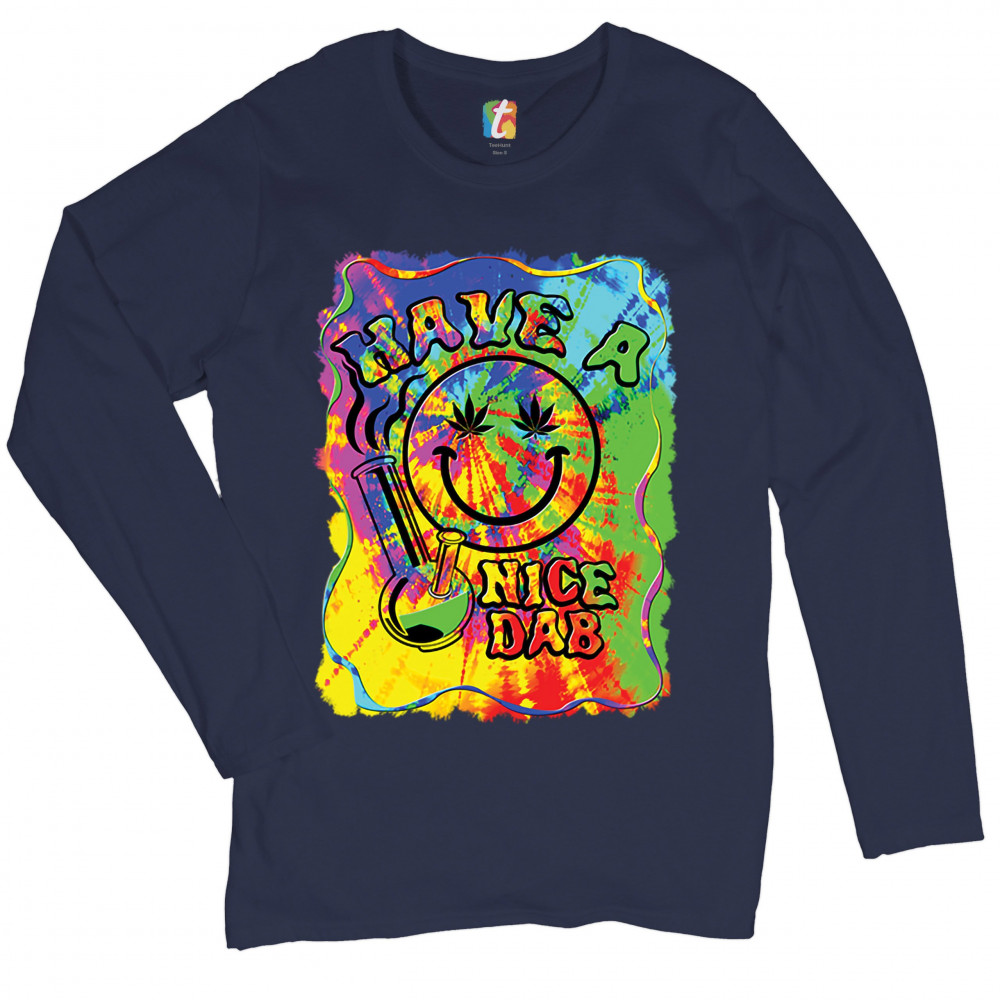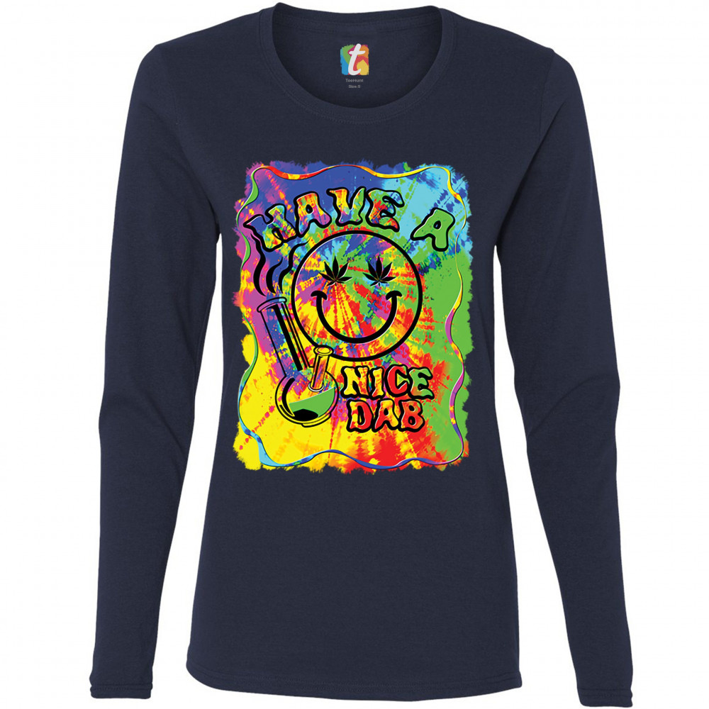 HAVE A NICE DAB women's long sleeve t-shirt 420 happy face hitting a weed bong navy blue