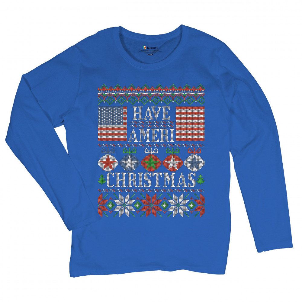 HAVE AMERI CHRISTMAS women's long sleeve t-shirt american flag ugly sweater royal blue