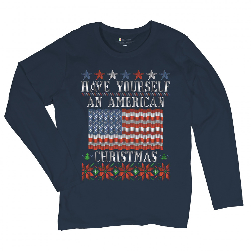 HAVE YOURSELF AN AMERICAN CHRISTMAS women's long sleeve t-shirt ugly sweater navy blue