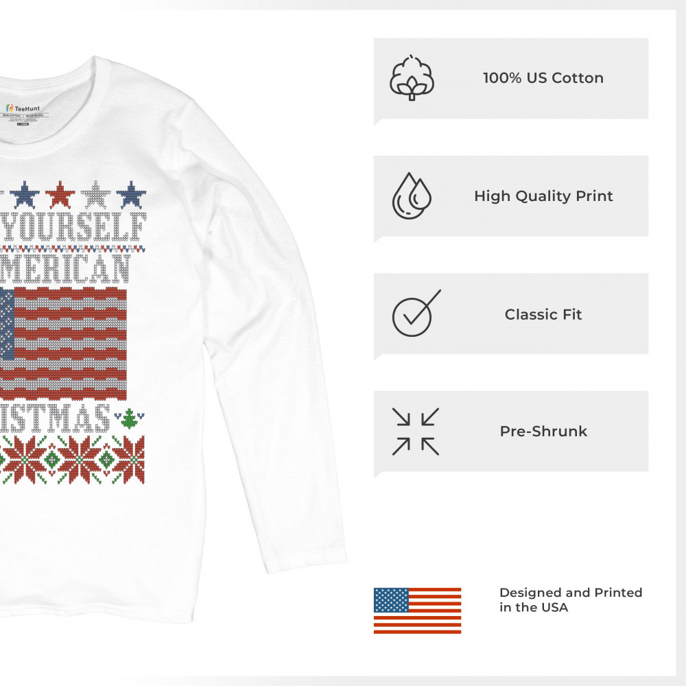 A print saying: "Have Yourself an American Christmas" and featuring an American flag. The print is designed as an ugly sweater. Amazing choice to express your patriotism while celebrating Christmas.