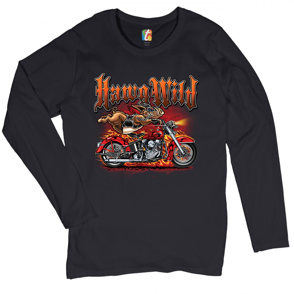 A print featuring a warthog biker holding onto the handlebars of a motorcycle riding so fast, it's body is lifted from the bike. The bike is on fire and there a lightning strikes in the background. The print says: "Hawg Wild". A great choice for a motorcy