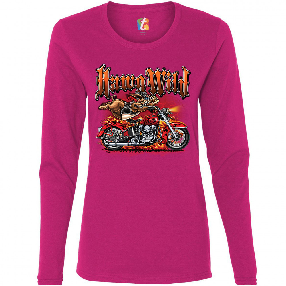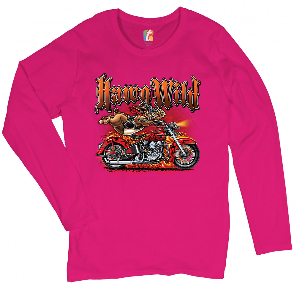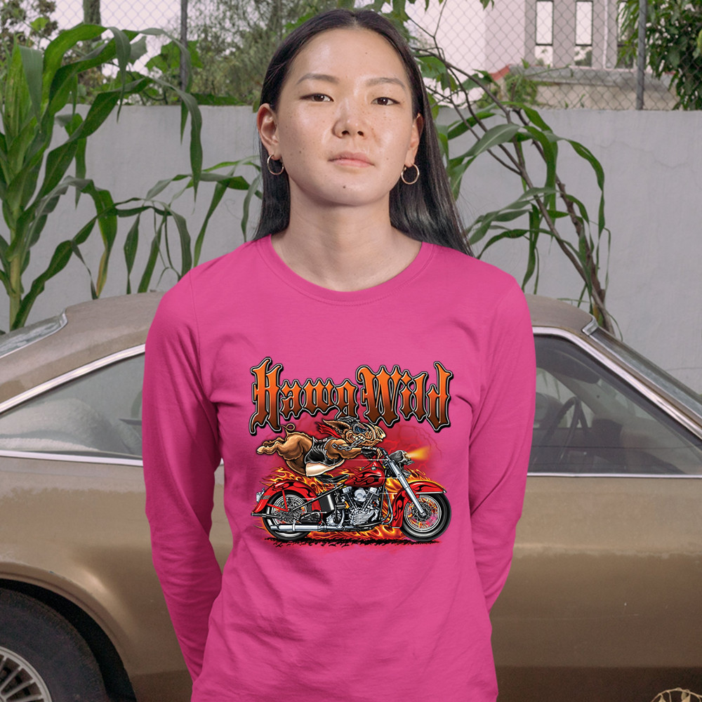 A print featuring a warthog biker holding onto the handlebars of a motorcycle riding so fast, it's body is lifted from the bike. The bike is on fire and there a lightning strikes in the background. The print says: "Hawg Wild". A great choice for a motorcy