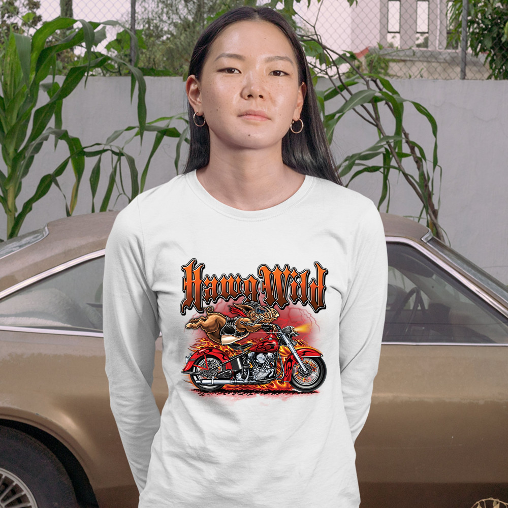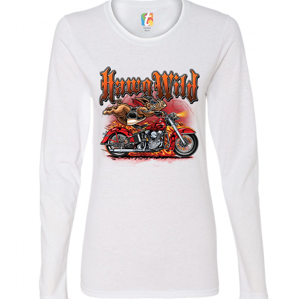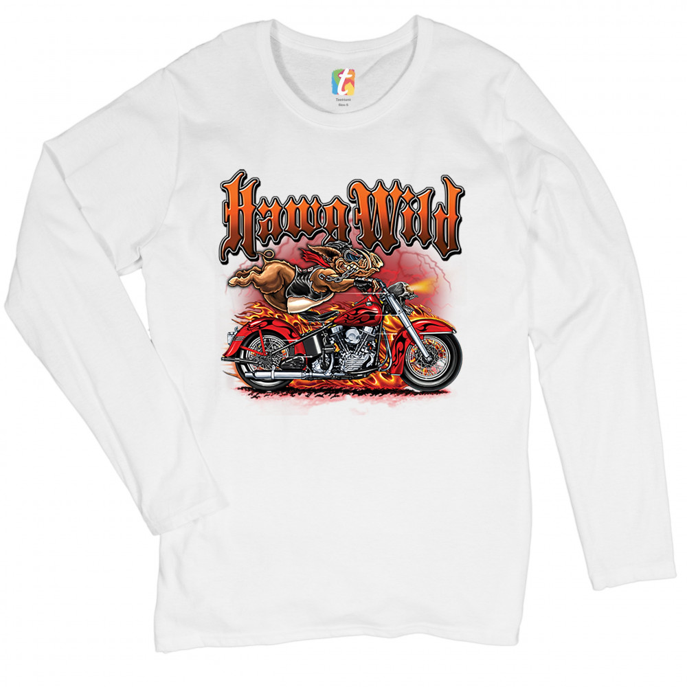 A print featuring a warthog biker holding onto the handlebars of a motorcycle riding so fast, it's body is lifted from the bike. The bike is on fire and there a lightning strikes in the background. The print says: "Hawg Wild". A great choice for a motorcy