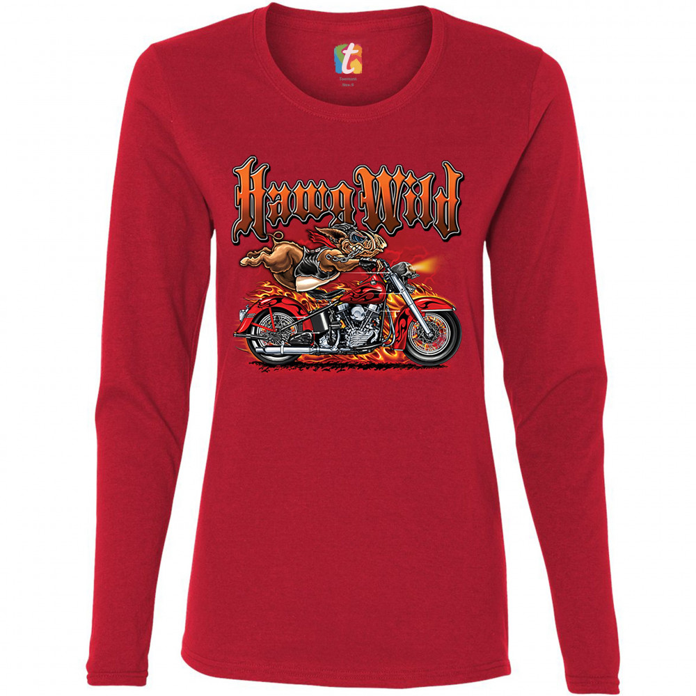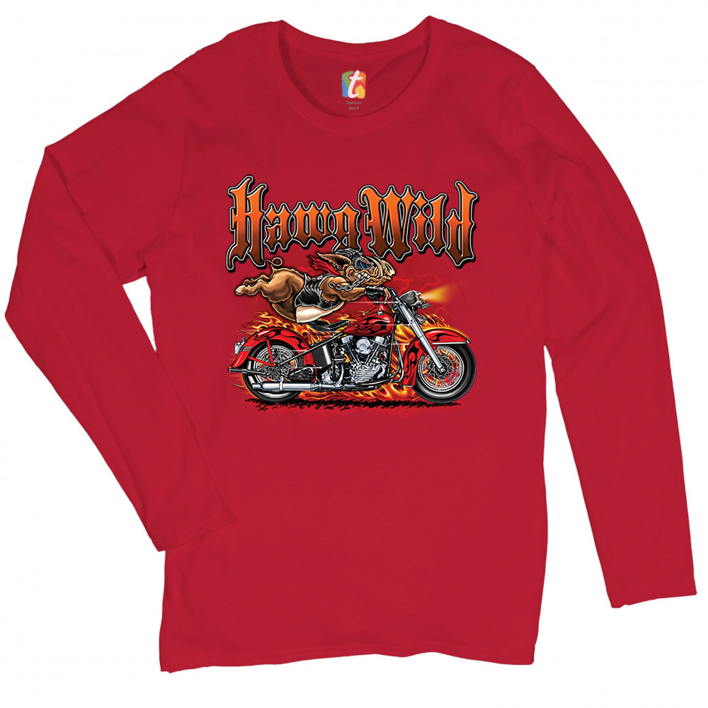 A print featuring a warthog biker holding onto the handlebars of a motorcycle riding so fast, it's body is lifted from the bike. The bike is on fire and there a lightning strikes in the background. The print says: "Hawg Wild". A great choice for a motorcy