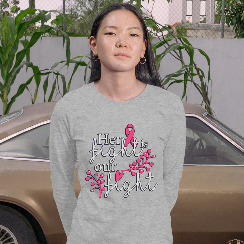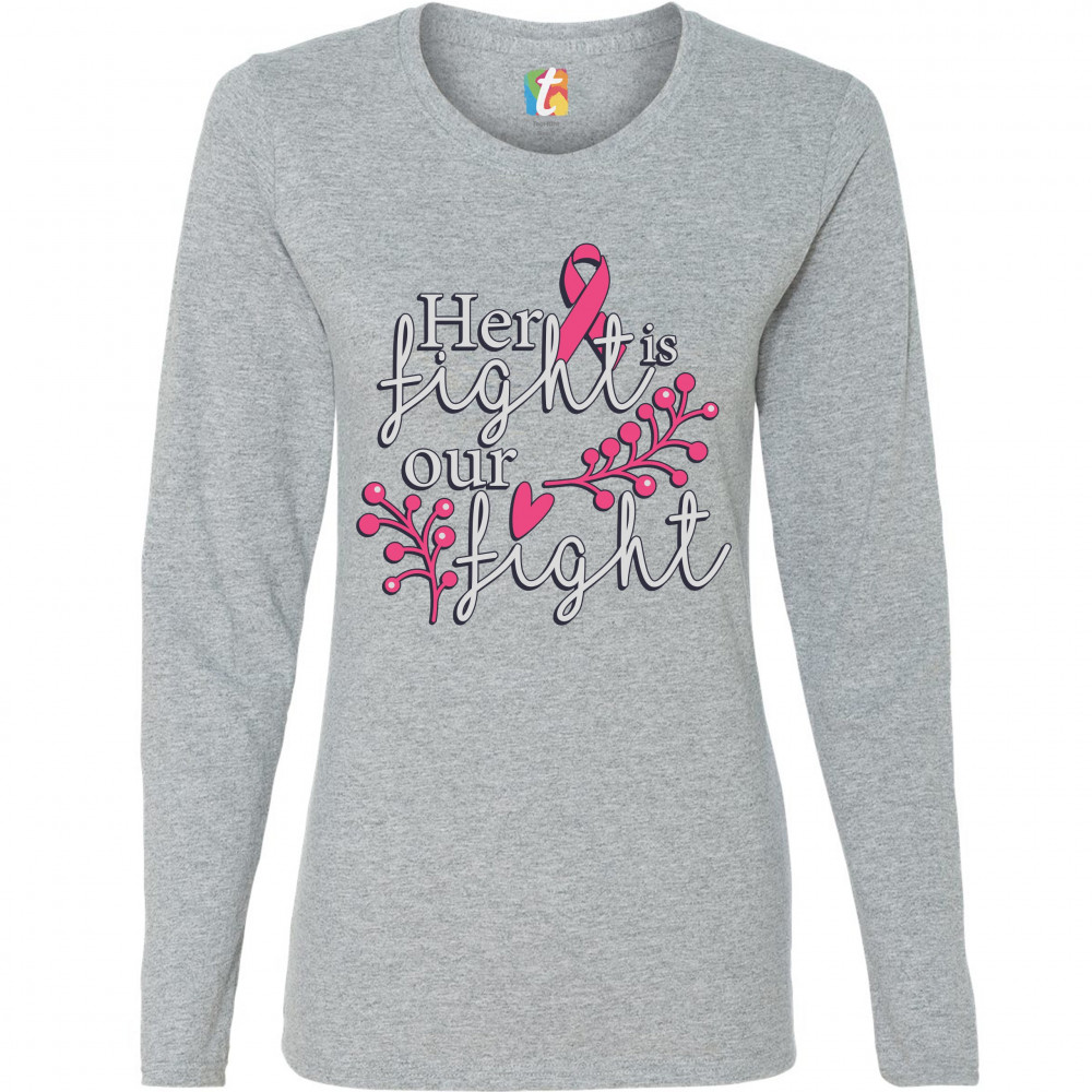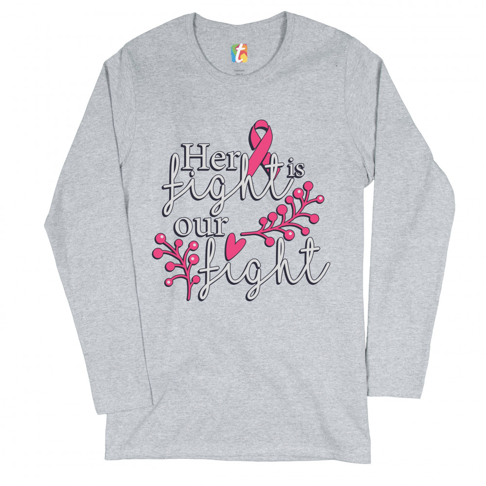 HER FIGHT IS OUR FIGHT women's long sleeve t-shirt breast cancer pink ribbon gray