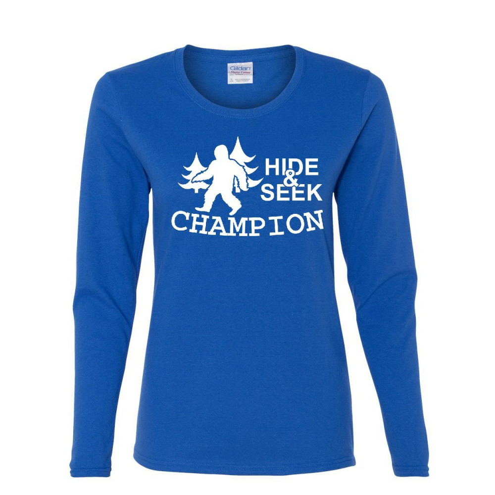 HIDE AND SEEK CHAMPION women's long sleeve tee bigfoot yeti funny humor royal blue