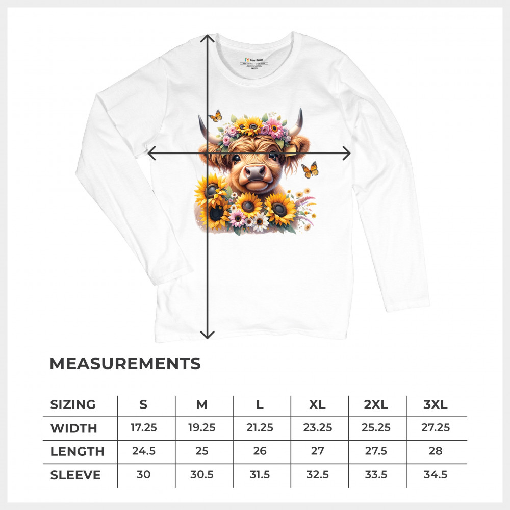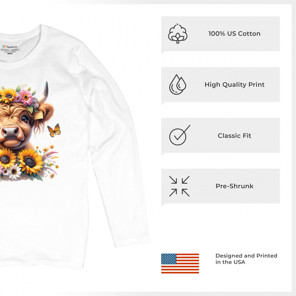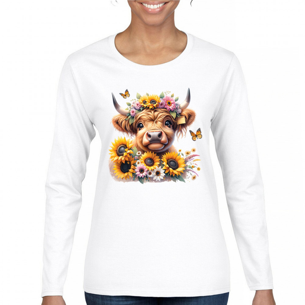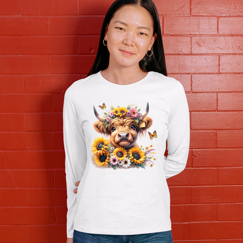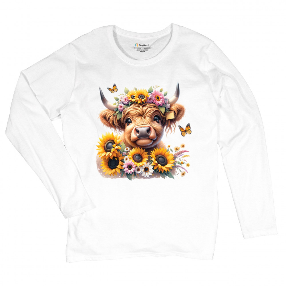 Highland Cow floral design with sunflowers and daisies, rustic farmhouse cow style, western ranch boho charm, and cozy country farmhouse shirt vibes.