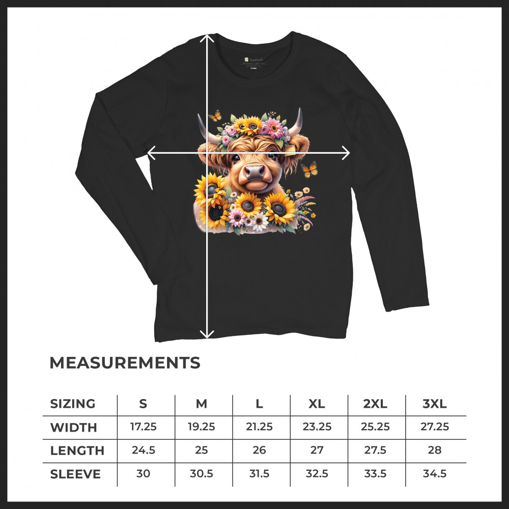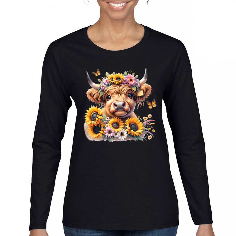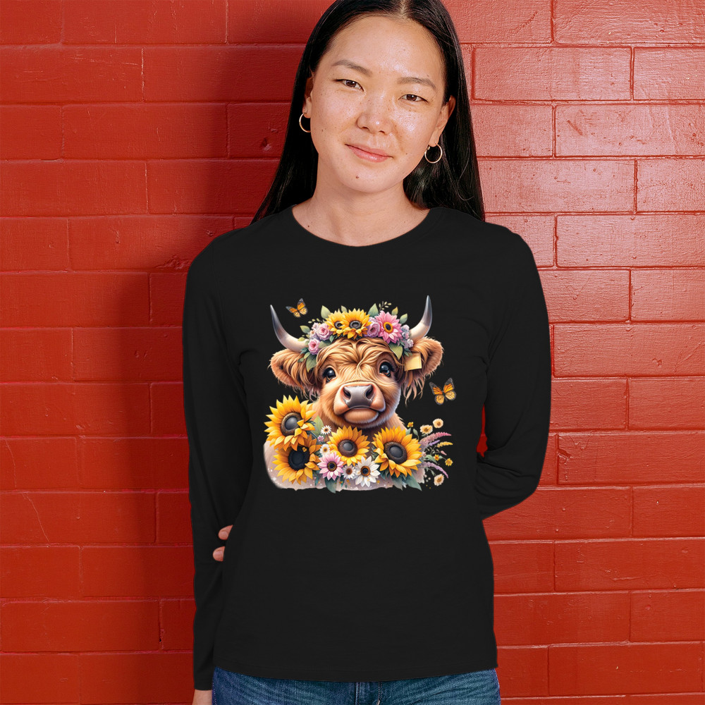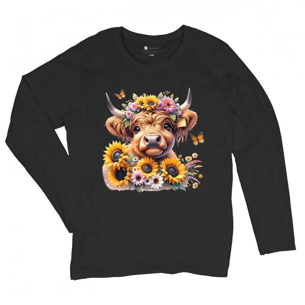 Highland Cow floral design with sunflowers and daisies, rustic farmhouse cow style, western ranch boho charm, and cozy country farmhouse shirt vibes.