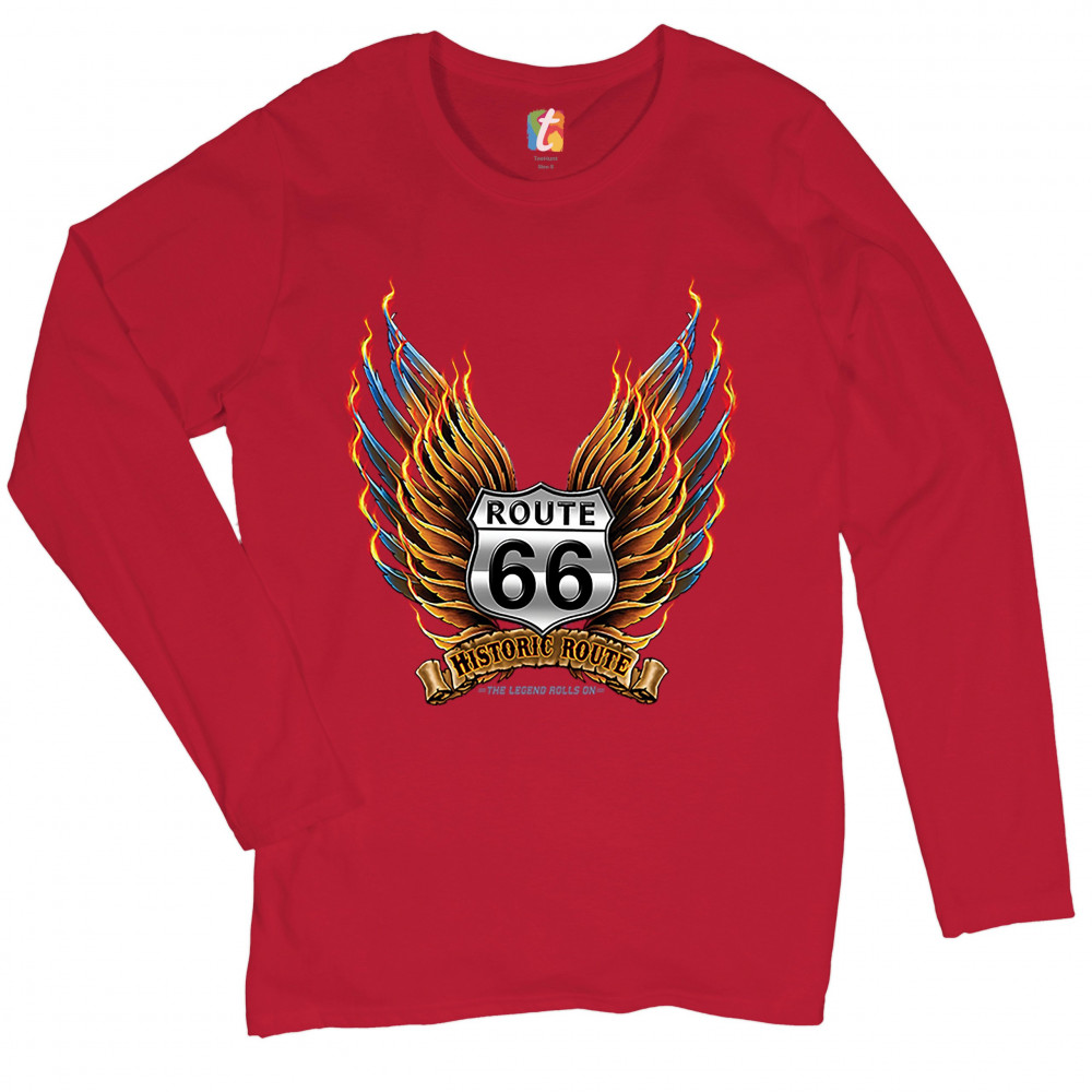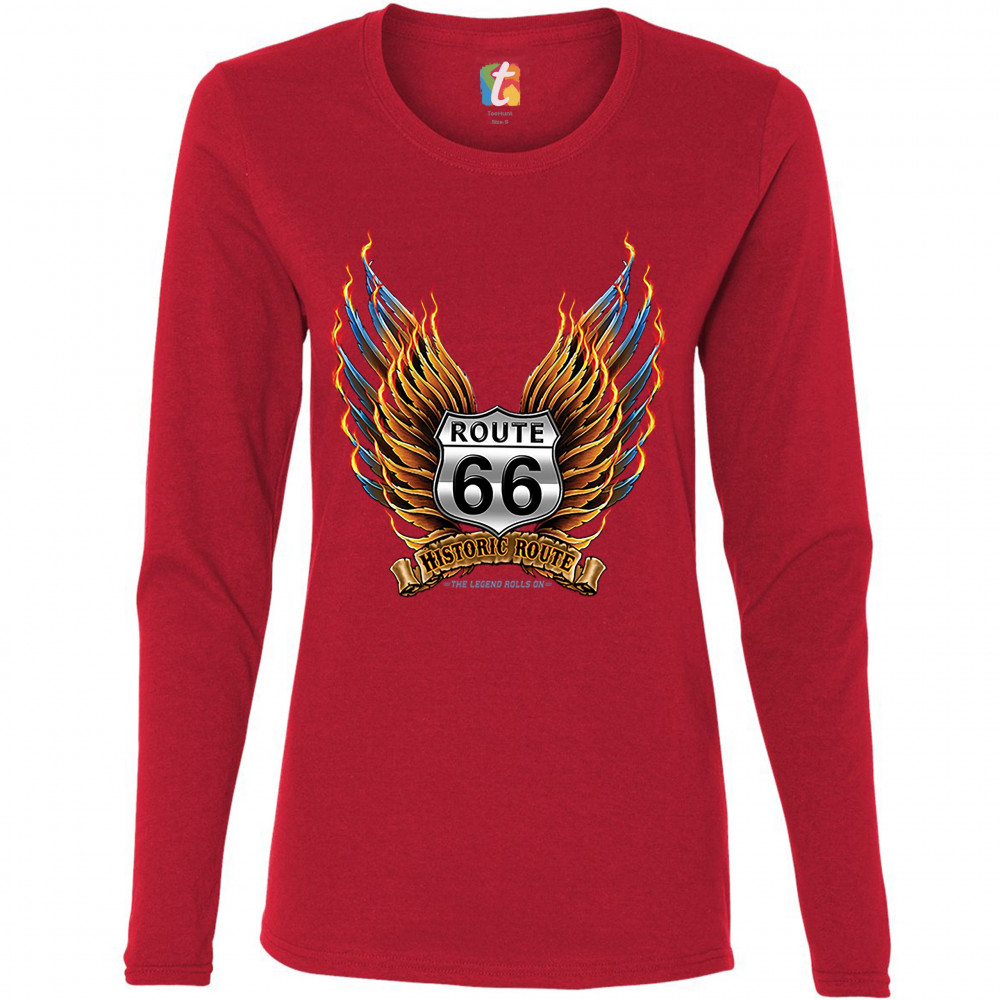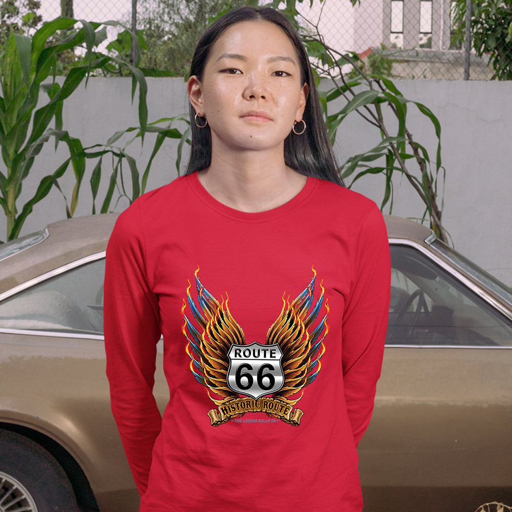 HISTORIC ROUTE 66 women's long sleeve t-shirt the legend rolls on mother road red