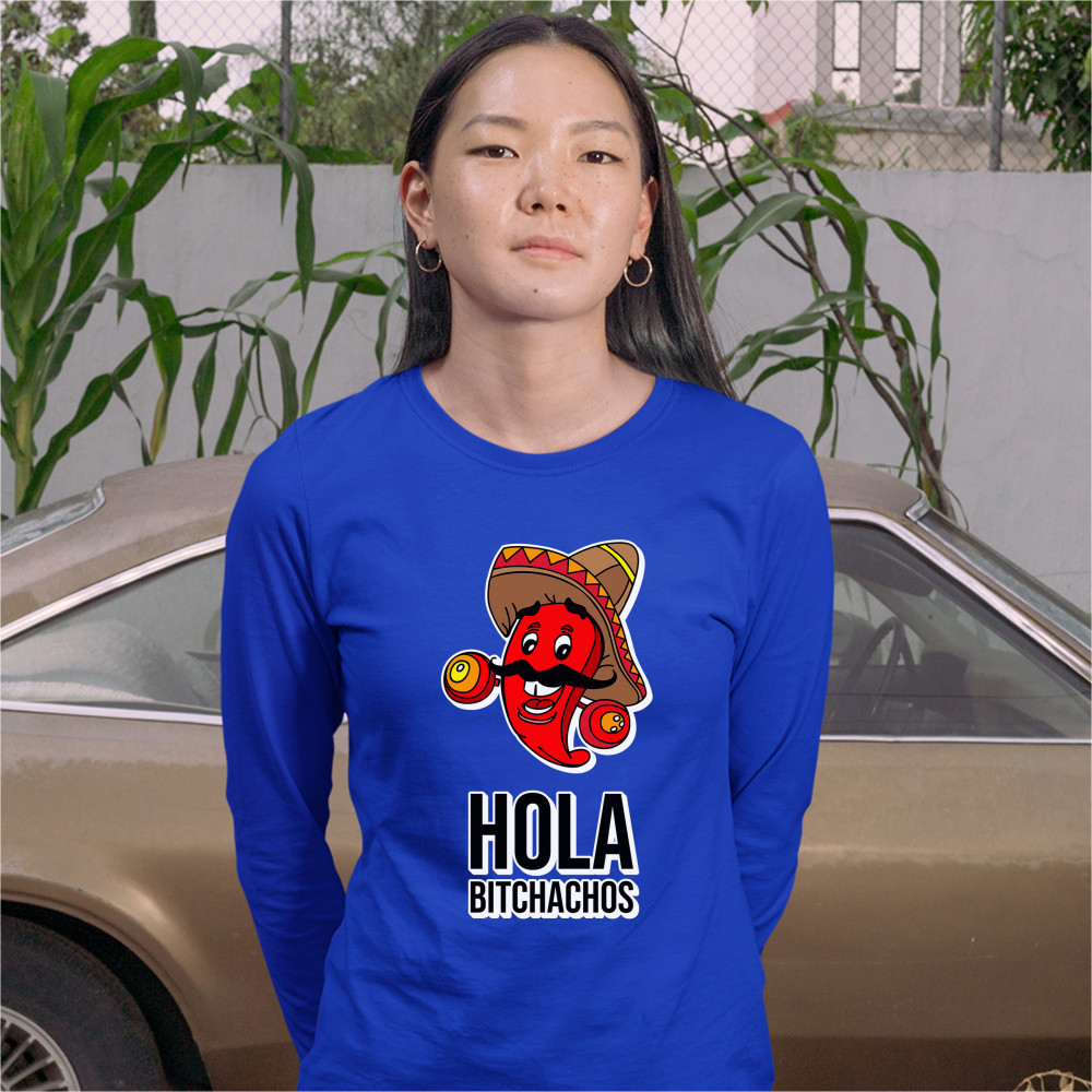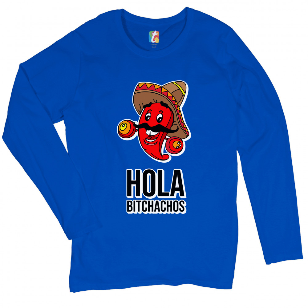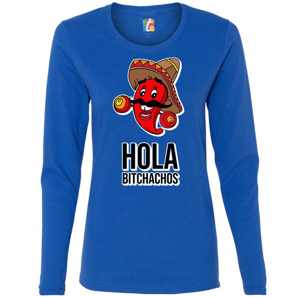 HOLA BITCHACHOS women's long sleeve t-shirt mexican chili pepper cinco de mayo royal blue