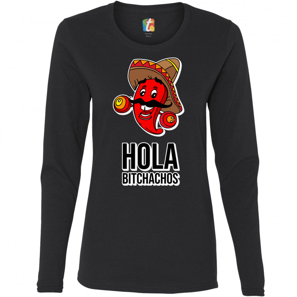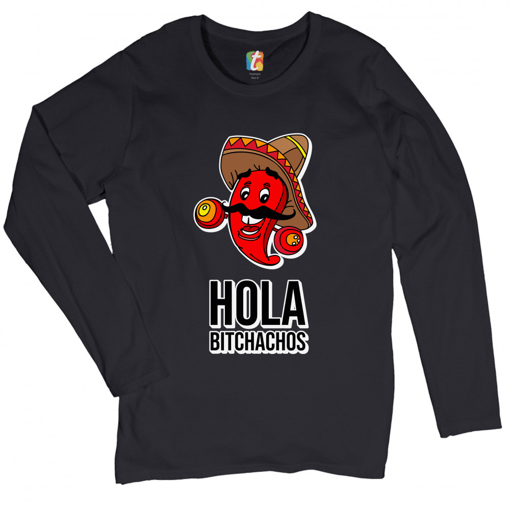 HOLA BITCHACHOS women's long sleeve t-shirt mexican chili pepper cinco de mayo black