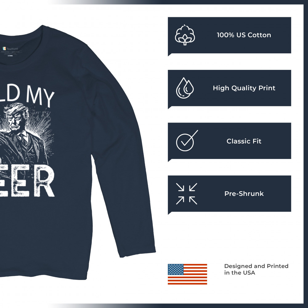 Celebrate the boldness of America First with the "Hold My Beer" design. A tribute to Trump supporters, conservatives, and proud patriots, this graphic humorously encapsulates the resilience and pride of the Red Wave movement. Perfect for rallies, casual gatherings, and those who proudly stand with Donald J. Trump, the 47th President, in the fight for freedom and the people's mandate.