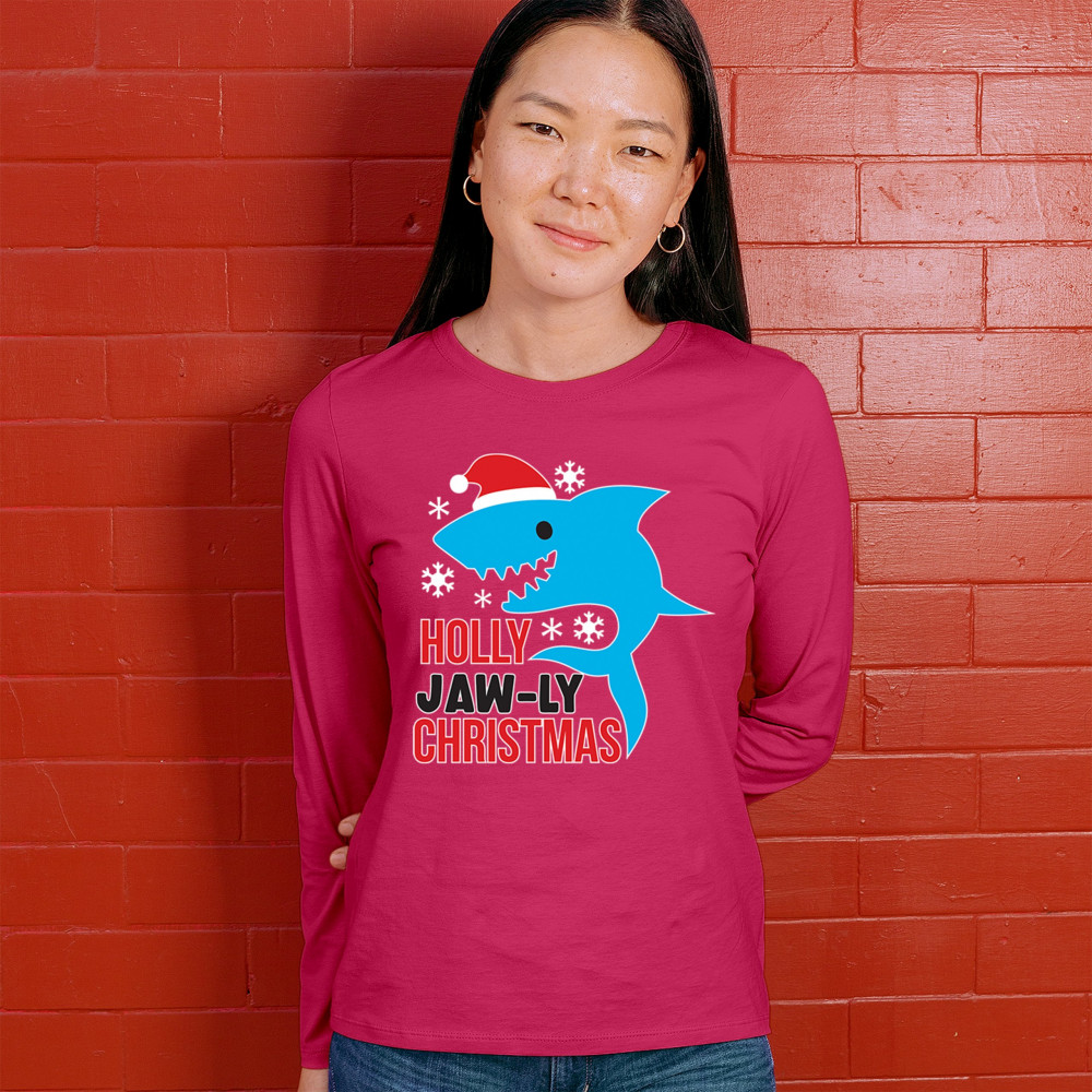 Funny Holly Jaw-ly Christmas shark pun design with Santa hat and snowflakes. Perfect for ocean lovers, festive parties, and cheerful holiday fun.