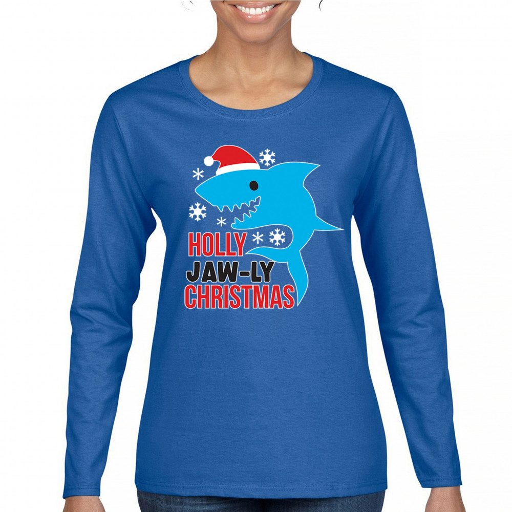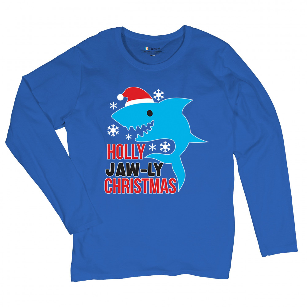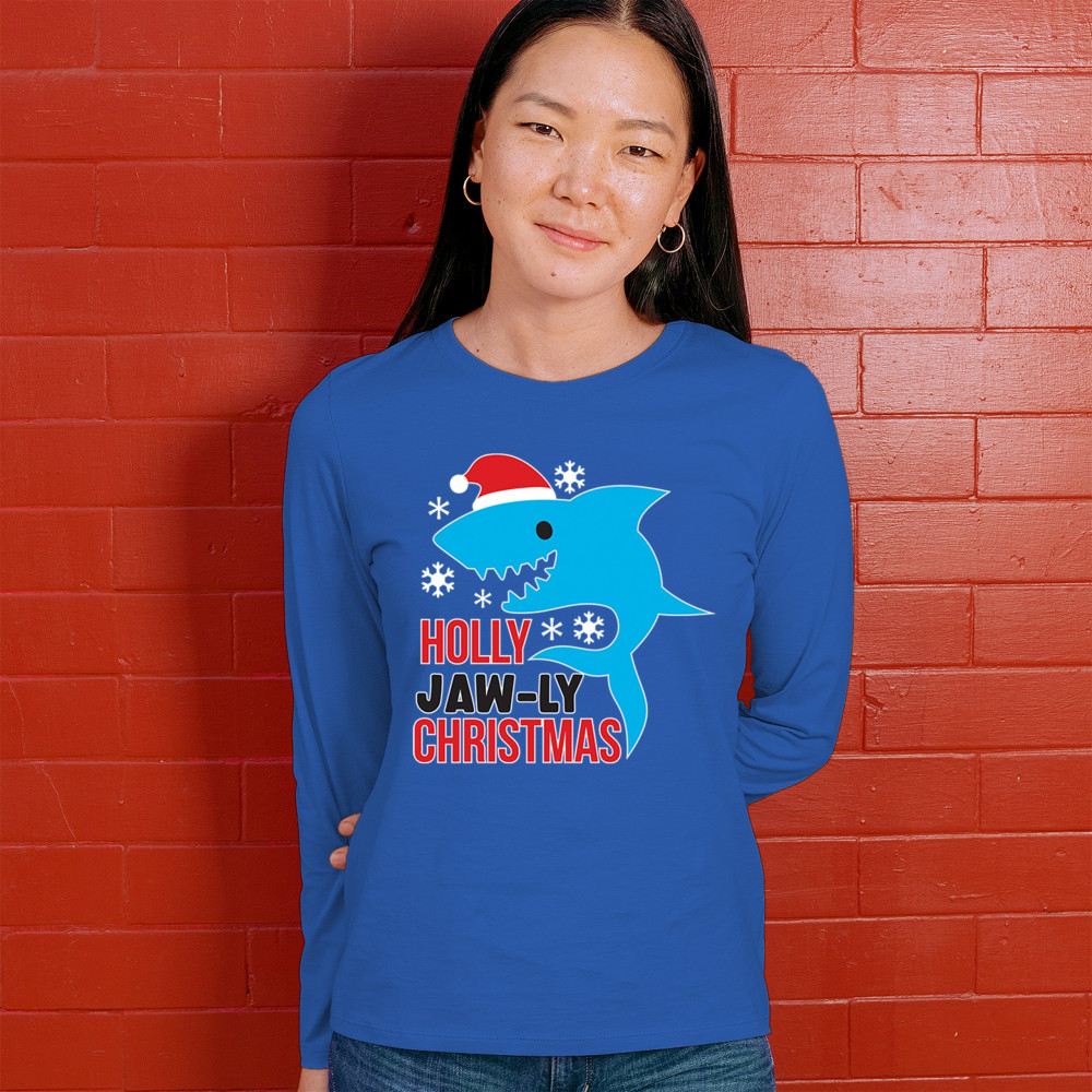 A fun Holly Jaw-ly Christmas design featuring a cheerful shark in a Santa hat with bright snowflake accents. Ideal for beach lovers, ocean fans, pun humor enthusiasts, Christmas parties, festive gatherings, white elephant events, and lighthearted winter celebrations. Brings a playful coastal vibe to holiday season outfits and gifts.