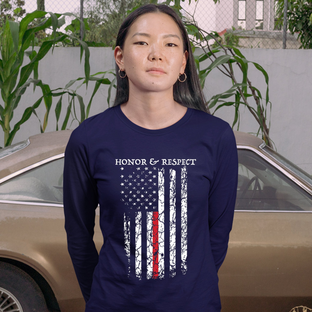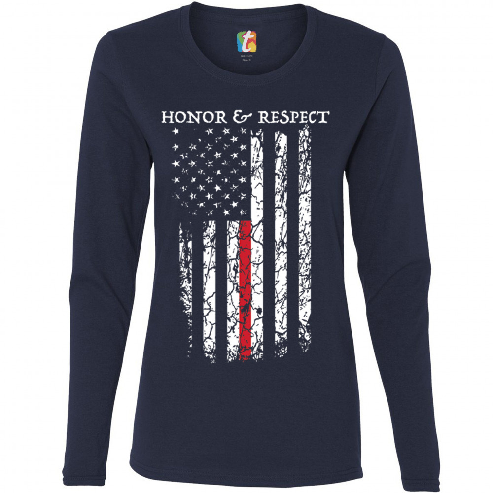 HONOR & RESPECT THIN RED LINE women's long sleeve t-shirt firefighter patriotic navy blue