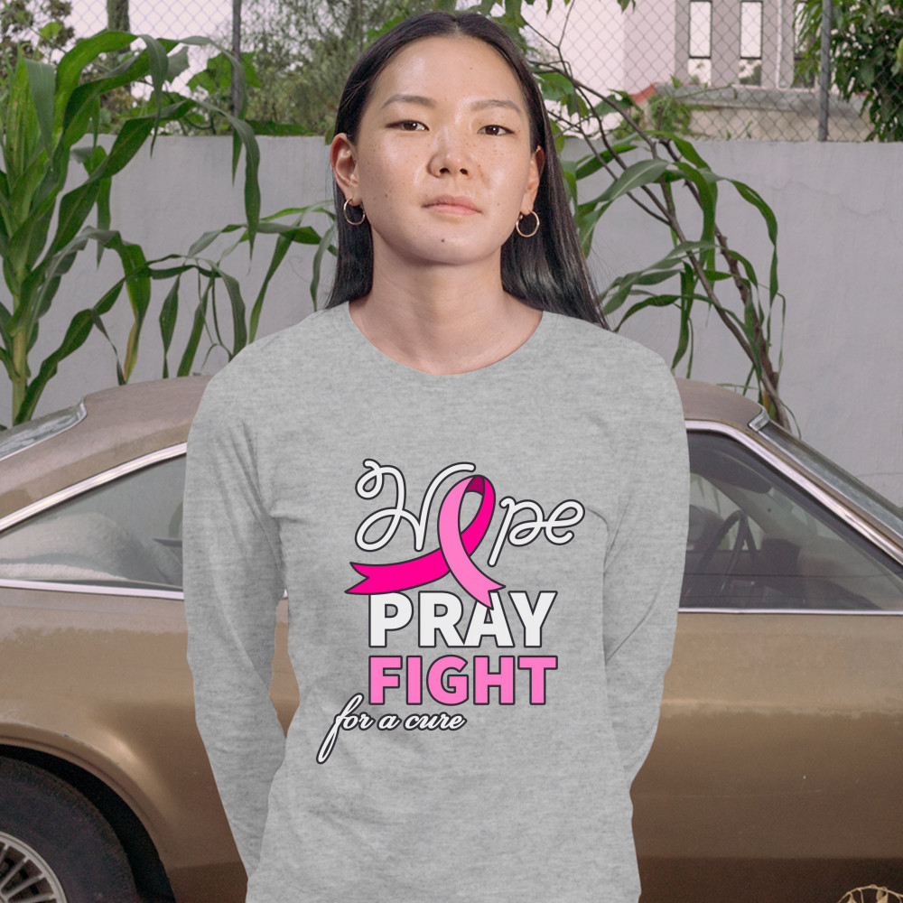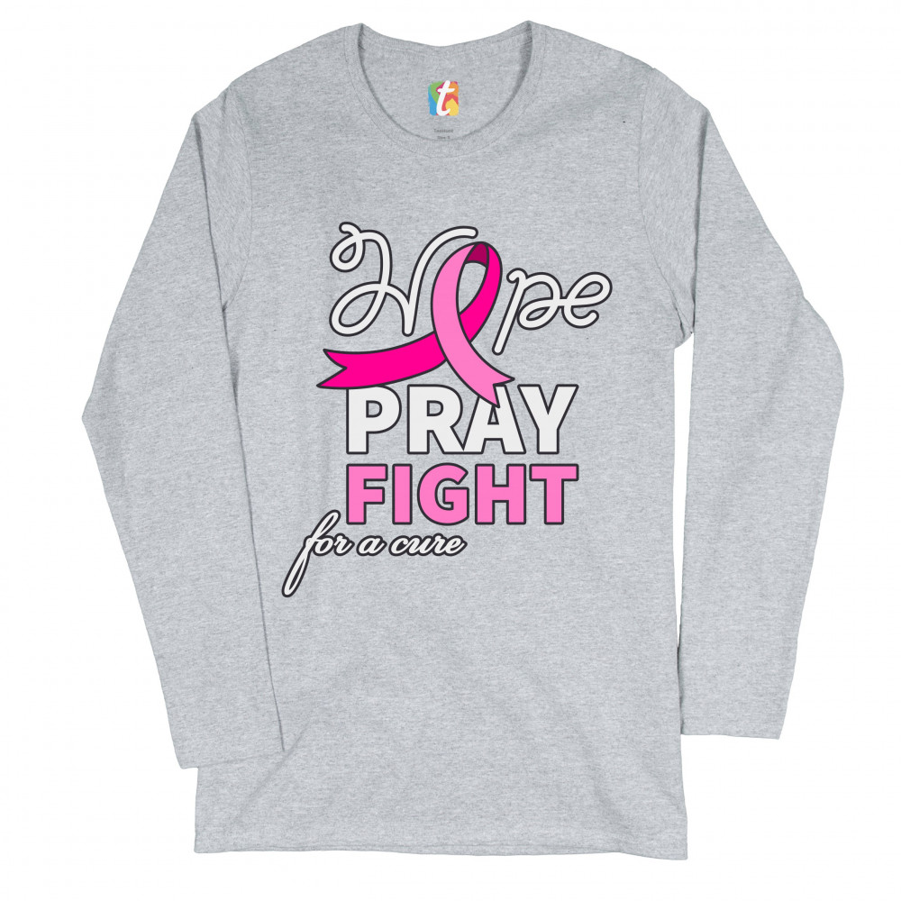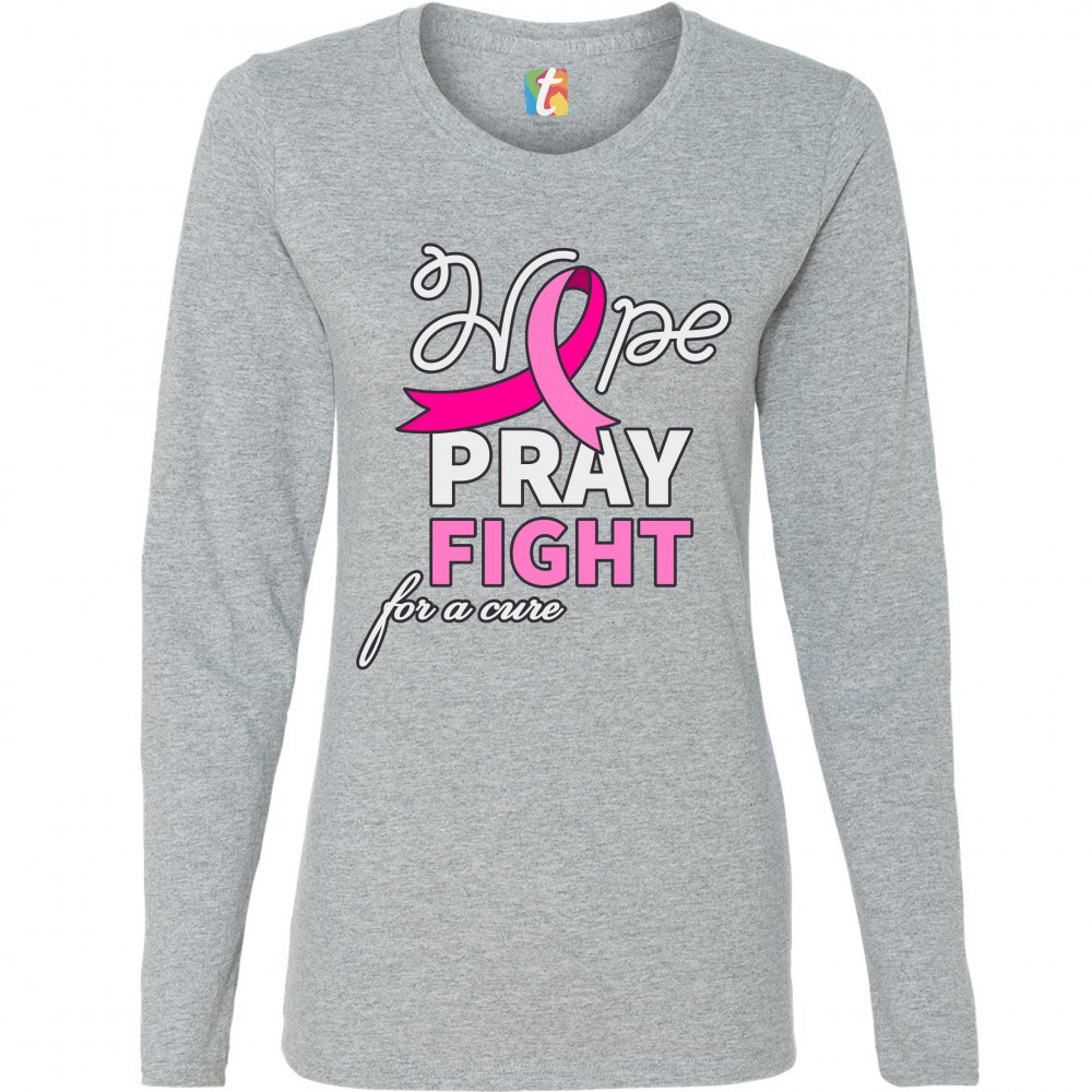 HOPE PRAY FIGHT FOR A CURE women's long sleeve t-shirt breast cancer awareness gray