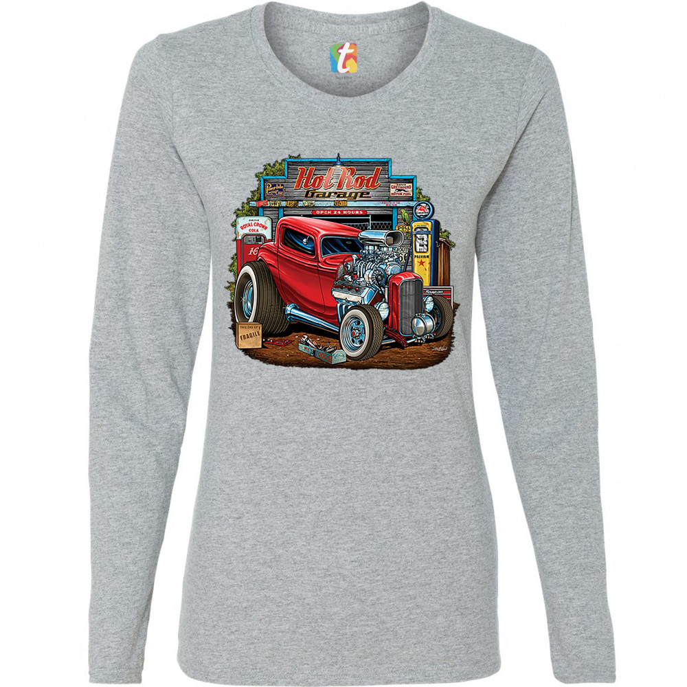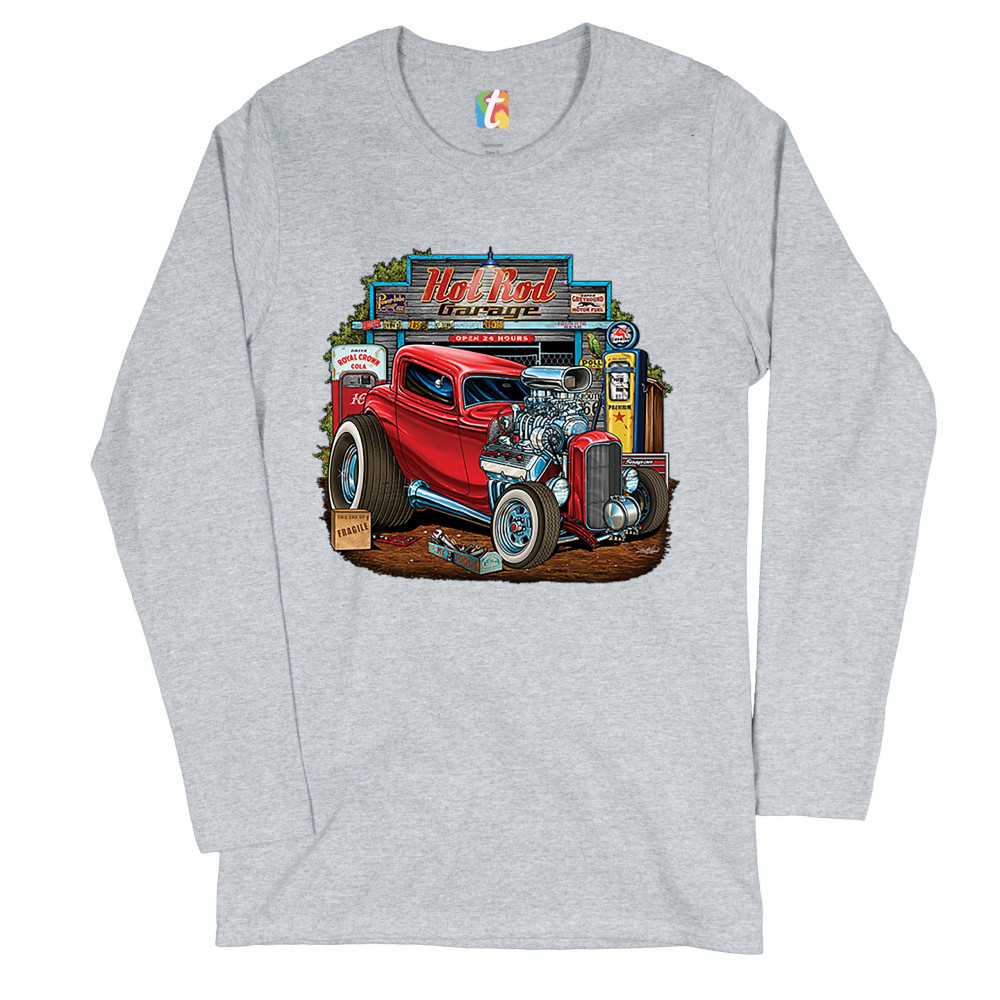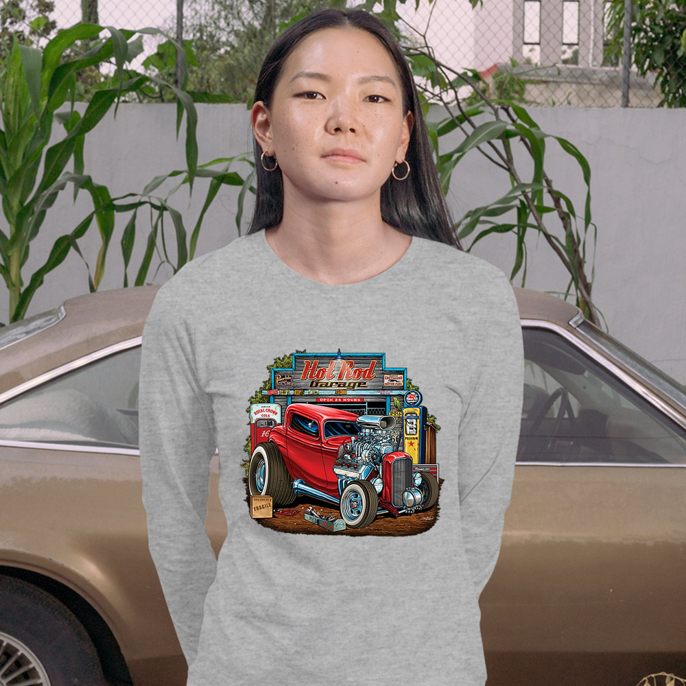 A print featuring a vintage hot rod with an exposed engine and plus-sized rear wheels. In the background there is a garage with a gas station and a sign that says: "Hot Rod Garage". A great choice for a fan of customized American classic cars and hot rods
