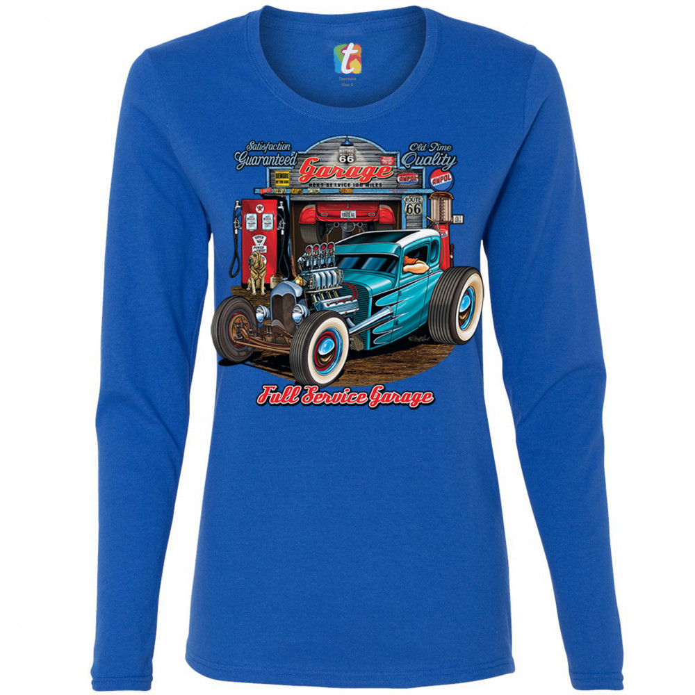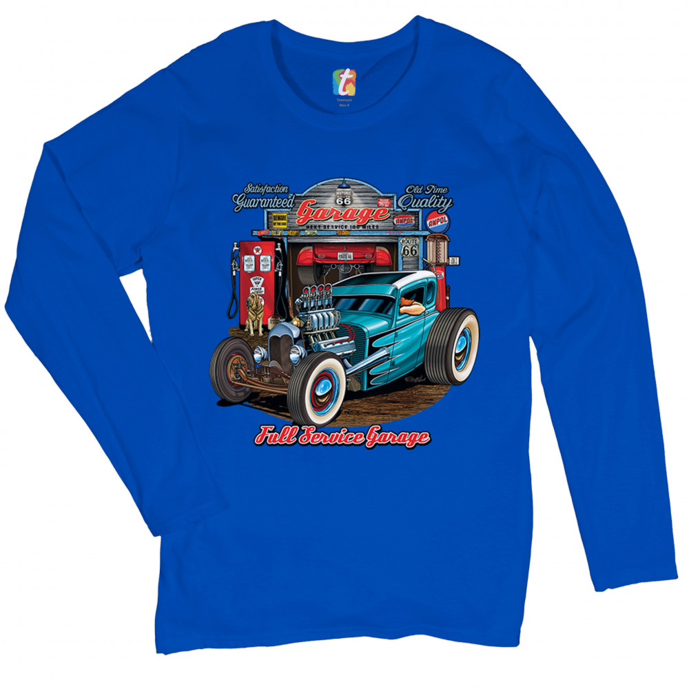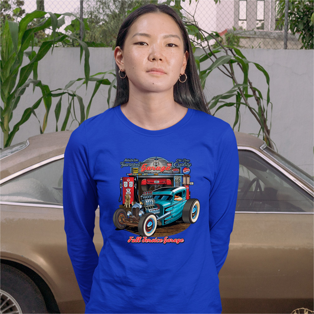 A print featuring a beautiful blue hot rod and a garage behind it. The garage has numerous signs on it which says :"Satisfaction guaranteed", "Old time quality", "Historic Route 66". Under the car it says: "Full service garage". Great for Route 66 and hot rod fans.