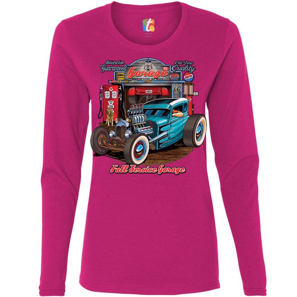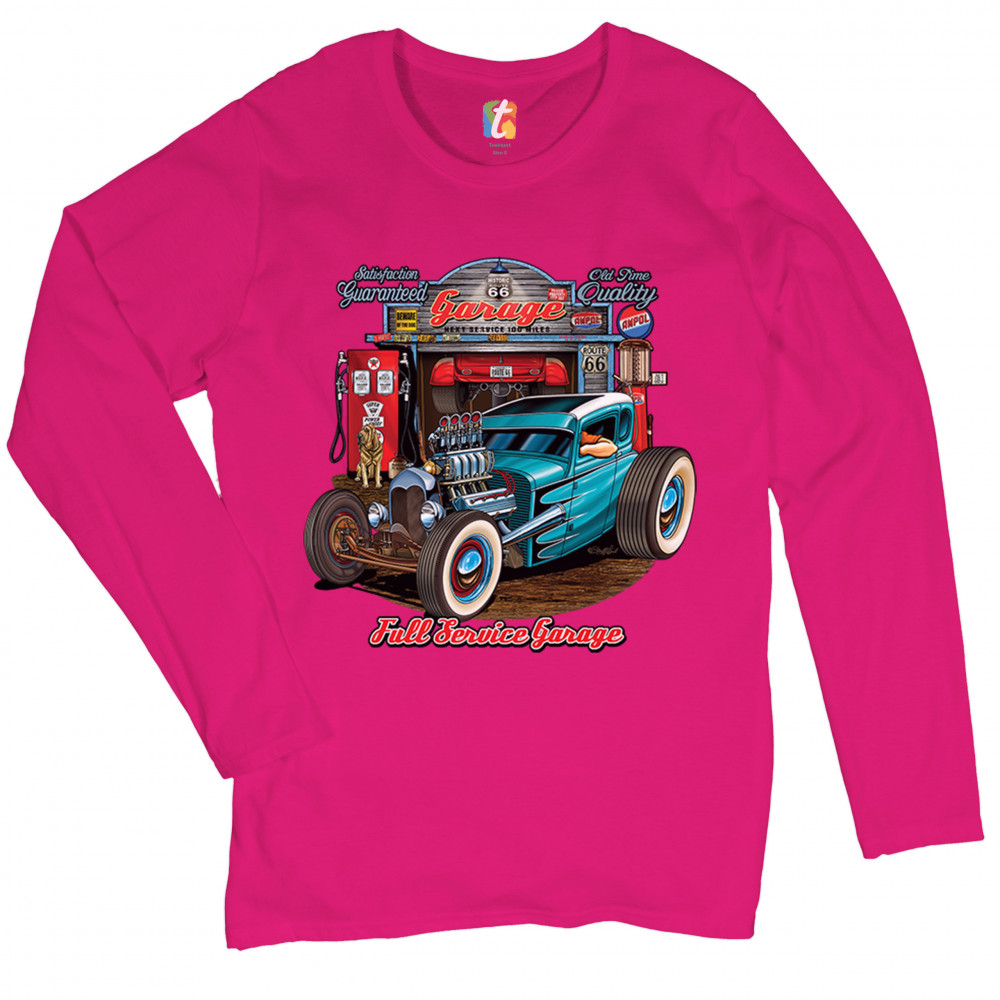 A print featuring a beautiful blue hot rod and a garage behind it. The garage has numerous signs on it which says :"Satisfaction guaranteed", "Old time quality", "Historic Route 66". Under the car it says: "Full service garage". Great for Route 66 and hot rod fans.
