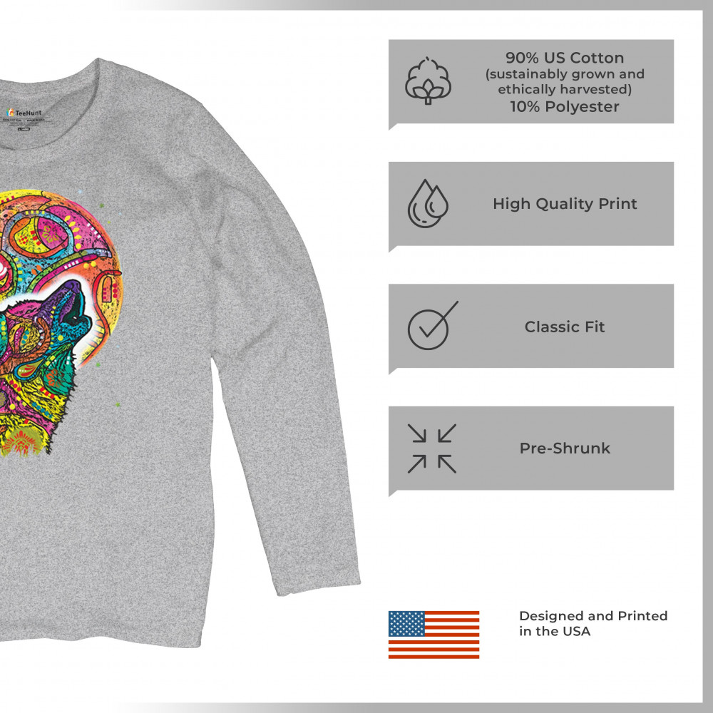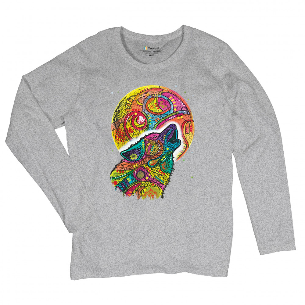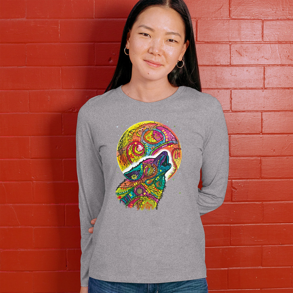 HOWLING WOLF AND MOON women's long sleeve t-shirt dean russo colorful wild life gray