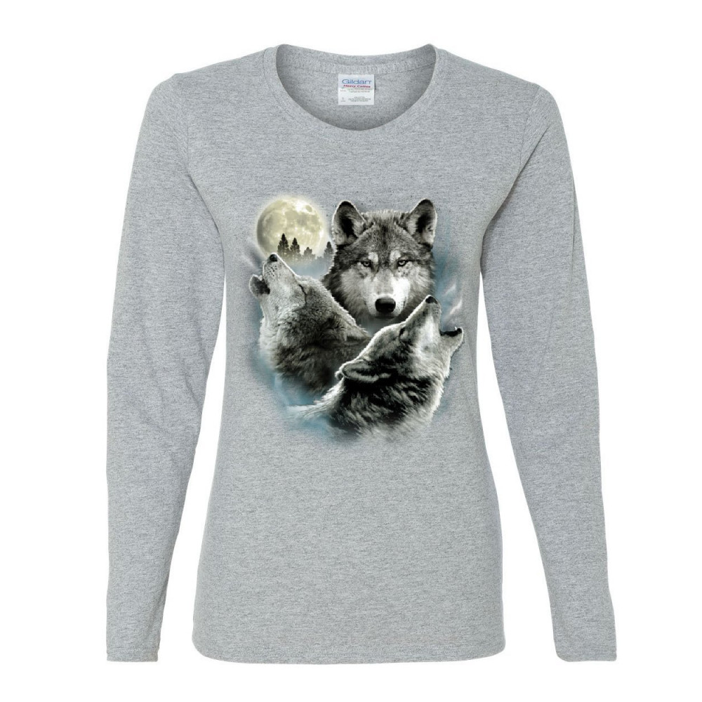 WOLF PACK HOWLING UP TO THE MOON howling wolf pack women's long sleeve tee wild wilderness animals nature moon gray