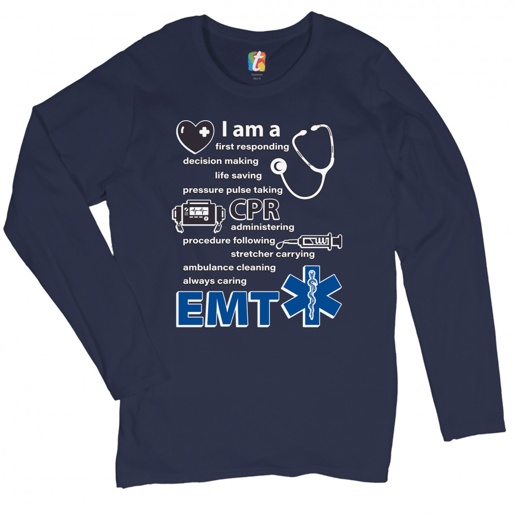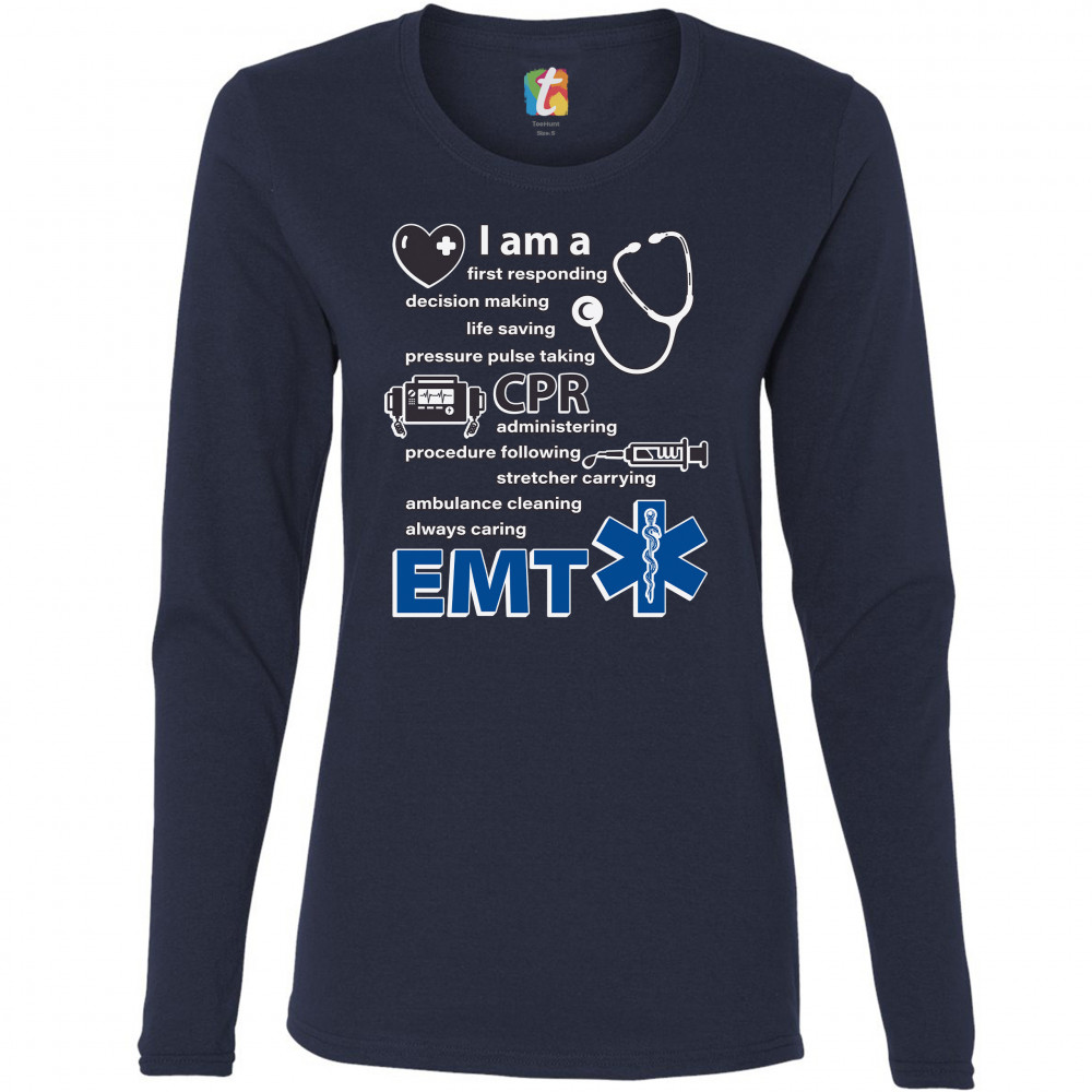 A print saying "I am a first responding, decision making, life saving, pressure pulse taking, CPR administering, procedure following, stretcher carrying, ambulance cleaning, always caring EMT". The print also features images of a heart, a stethoscope, a defibrillator, a syringe and the Star of Life. A great choice as a gift for a first responder.