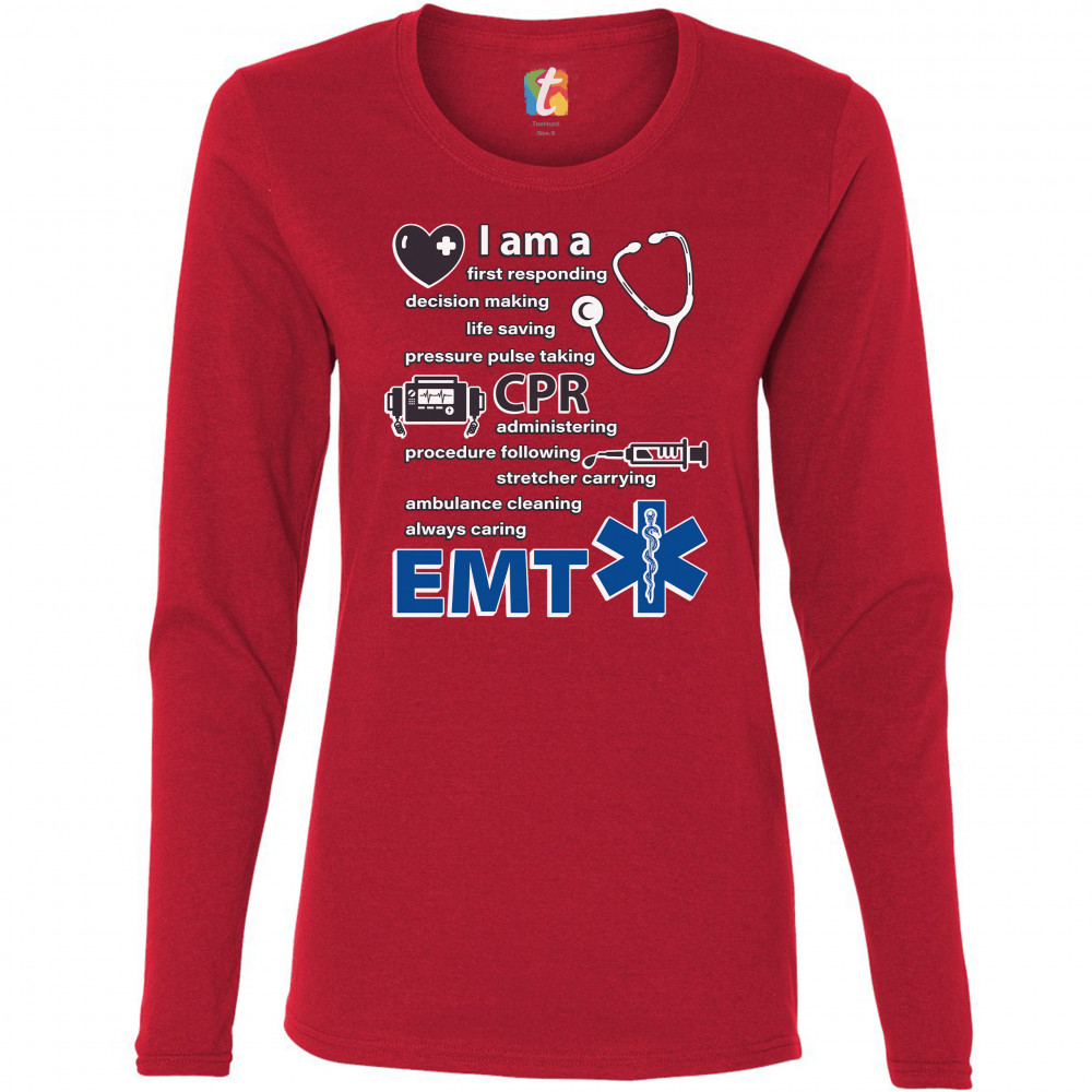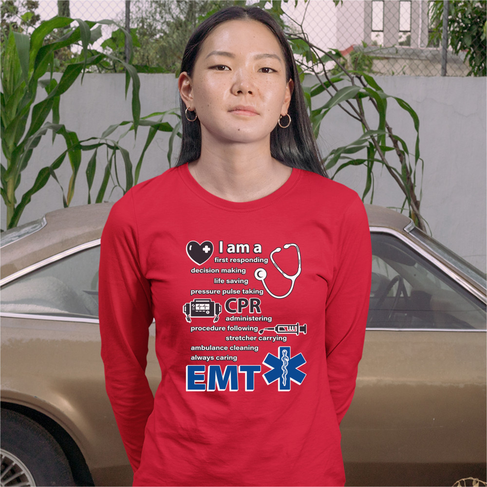 A print saying "I am a first responding, decision making, life saving, pressure pulse taking, CPR administering, procedure following, stretcher carrying, ambulance cleaning, always caring EMT". The print also features images of a heart, a stethoscope, a defibrillator, a syringe and the Star of Life. A great choice as a gift for a first responder.