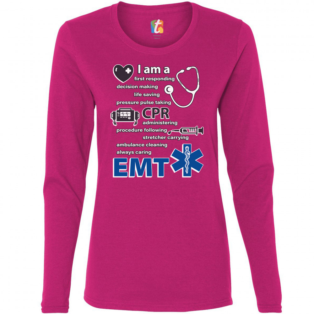 A print saying "I am a first responding, decision making, life saving, pressure pulse taking, CPR administering, procedure following, stretcher carrying, ambulance cleaning, always caring EMT". The print also features images of a heart, a stethoscope, a defibrillator, a syringe and the Star of Life. A great choice as a gift for a first responder.