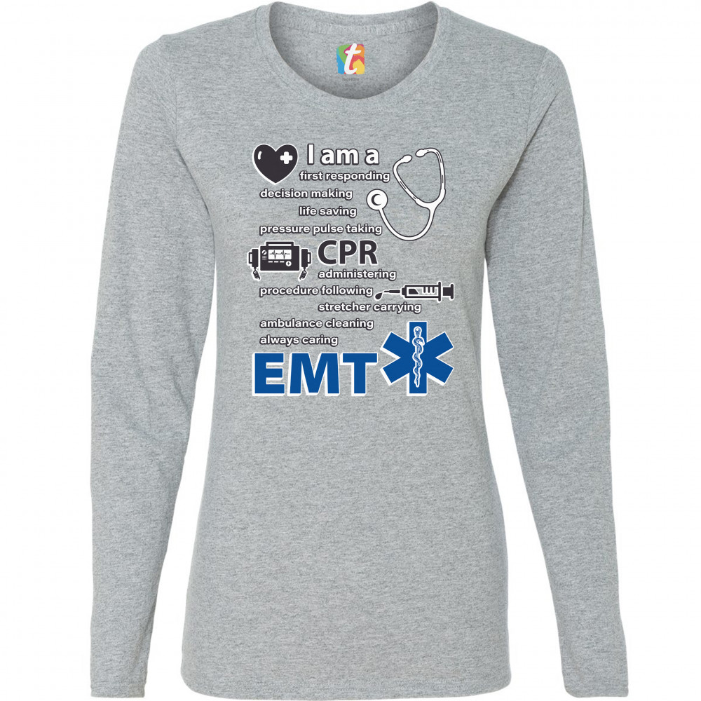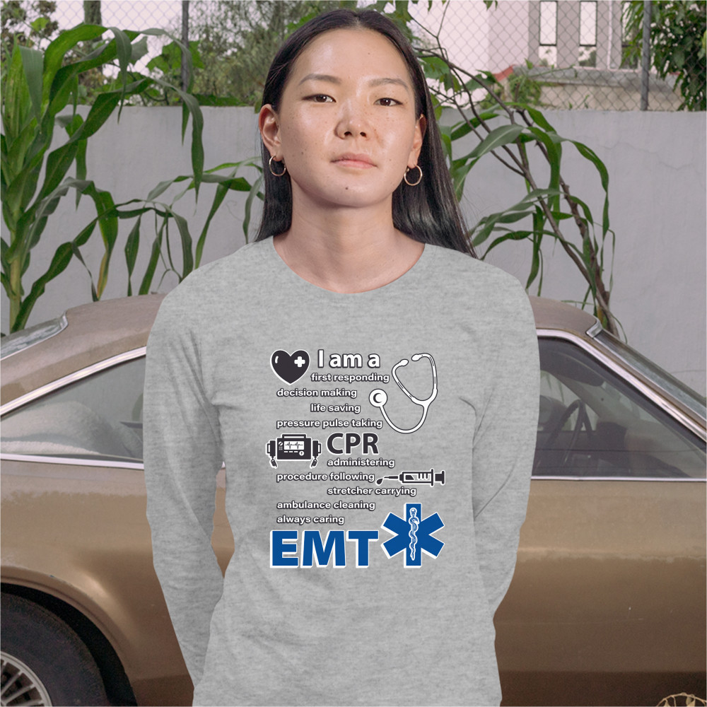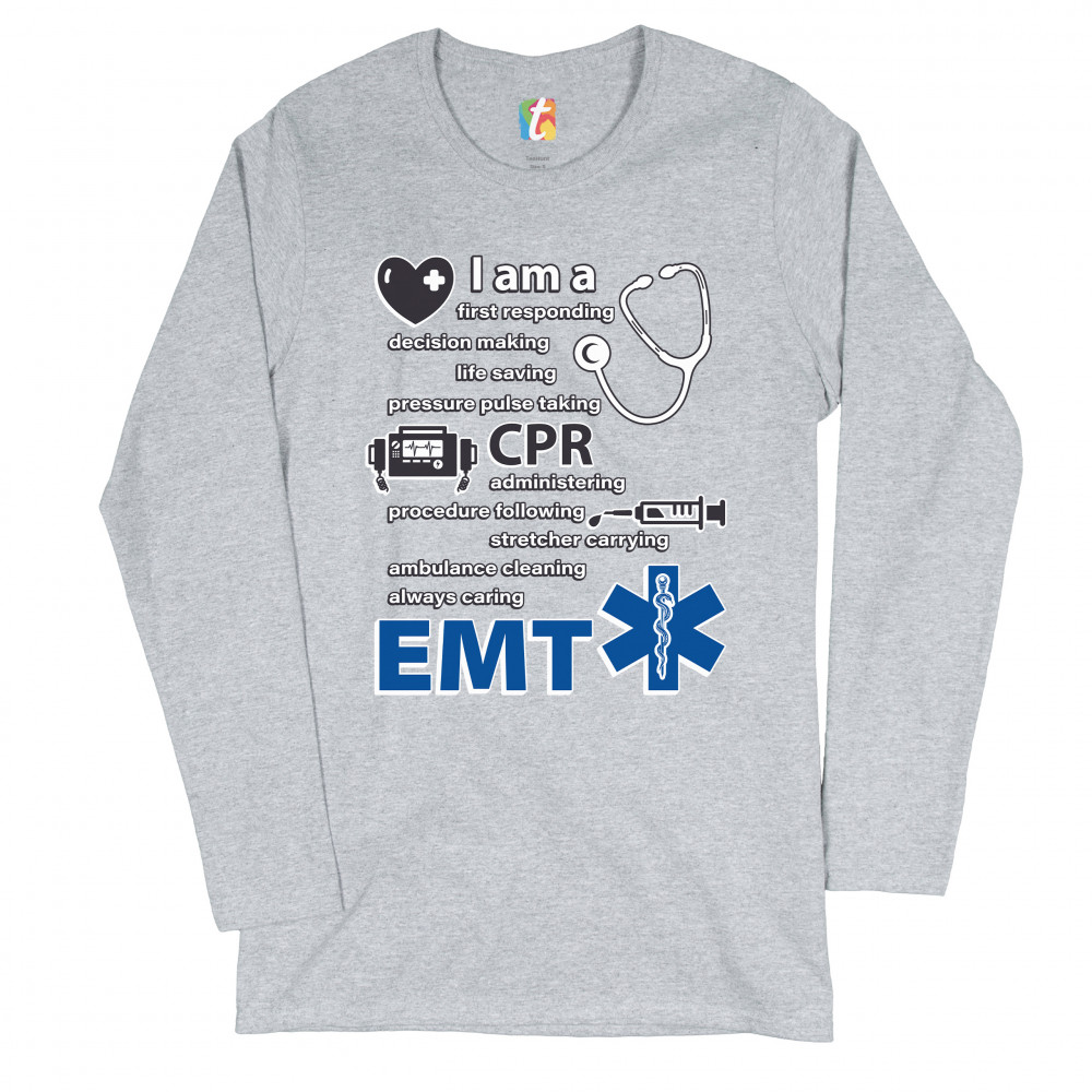 A print saying "I am a first responding, decision making, life saving, pressure pulse taking, CPR administering, procedure following, stretcher carrying, ambulance cleaning, always caring EMT". The print also features images of a heart, a stethoscope, a defibrillator, a syringe and the Star of Life. A great choice as a gift for a first responder.