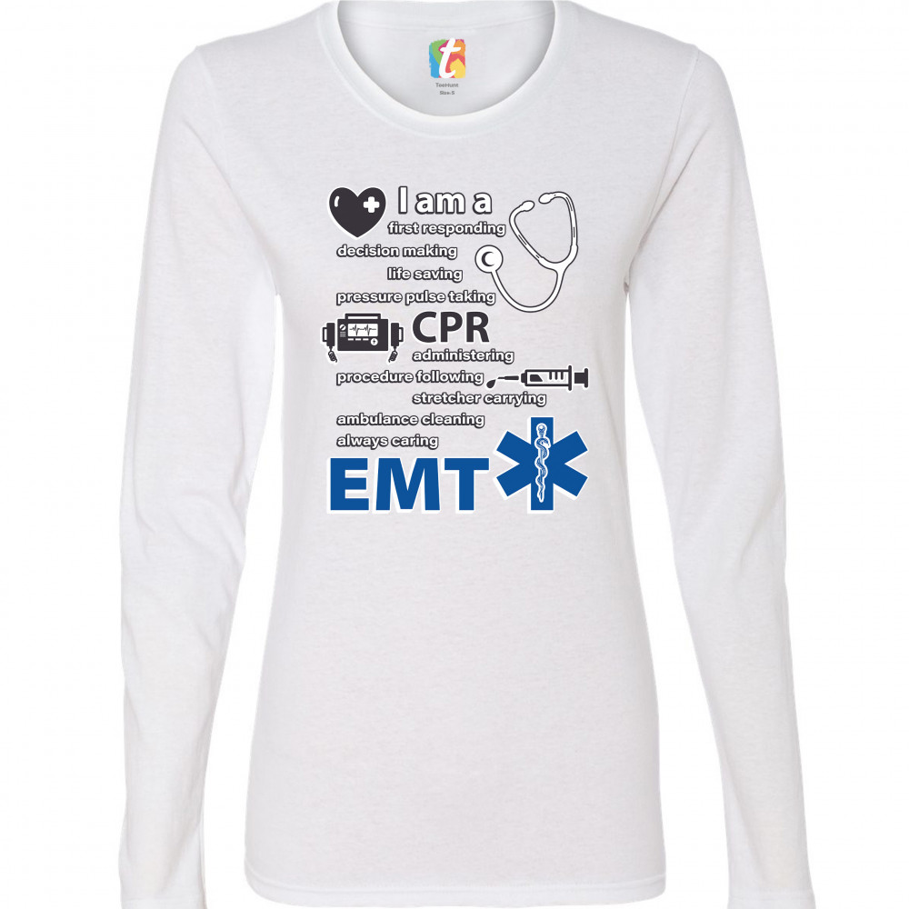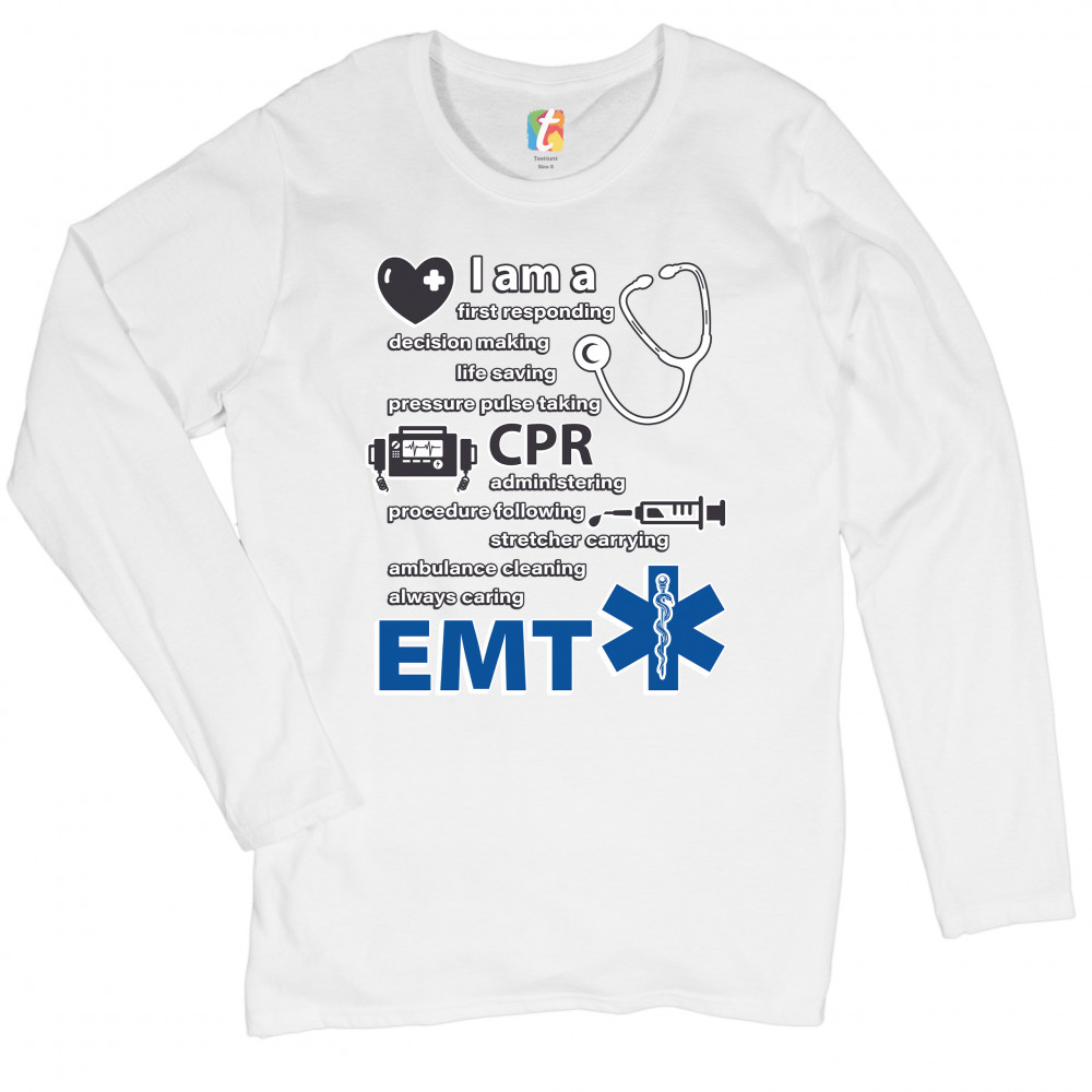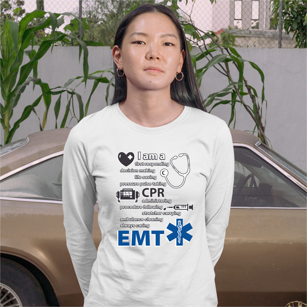 A print saying "I am a first responding, decision making, life saving, pressure pulse taking, CPR administering, procedure following, stretcher carrying, ambulance cleaning, always caring EMT". The print also features images of a heart, a stethoscope, a defibrillator, a syringe and the Star of Life. A great choice as a gift for a first responder.
