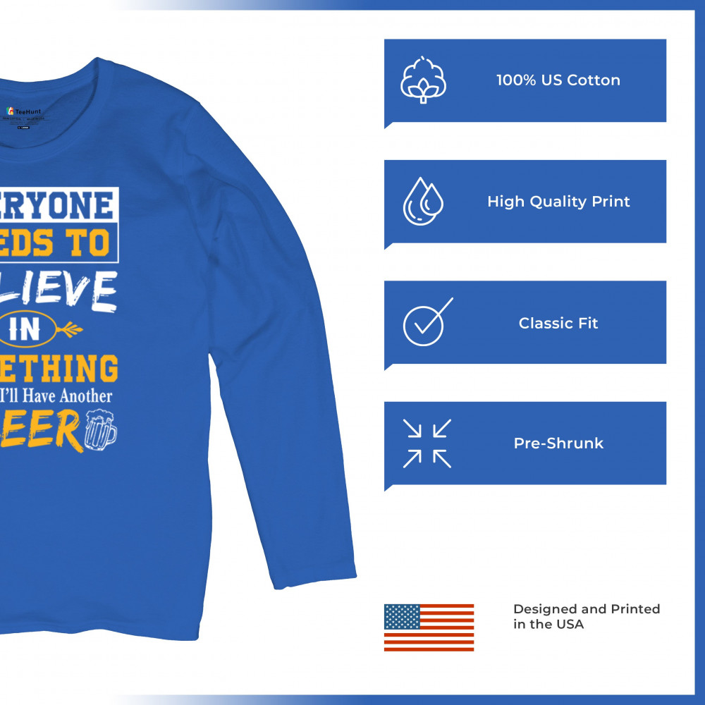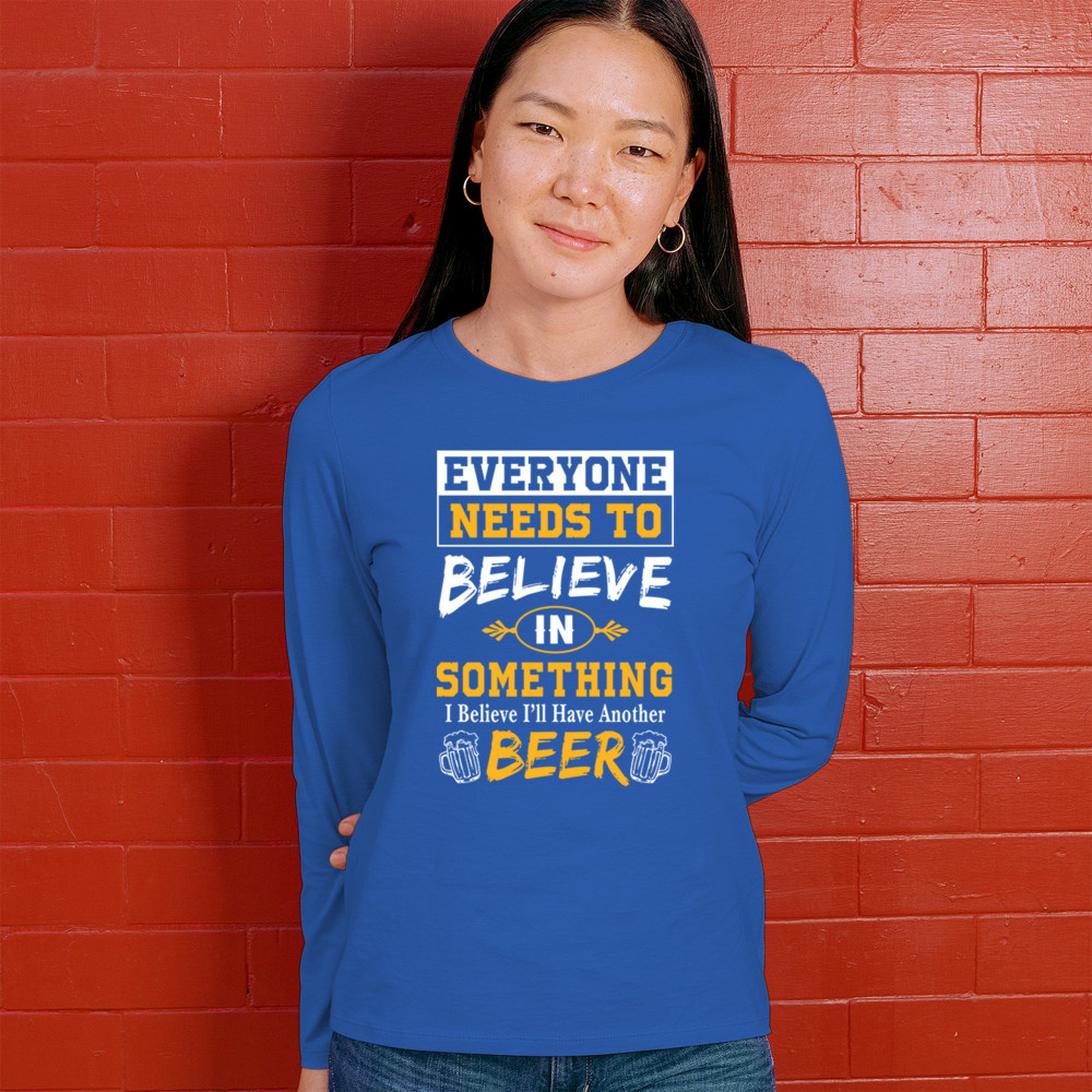Add some humor to your wardrobe with our "Everyone Needs to Believe in Something, I Believe I'll Have Another Beer" design. Featuring a witty slogan and beer-themed graphics, this design is perfect for casual outings, beer festivals, and social gatherings. Ideal for beer lovers and anyone who enjoys a good laugh, it makes a fantastic gift for friends and family. Celebrate your love for beer and good times with this fun and playful design!