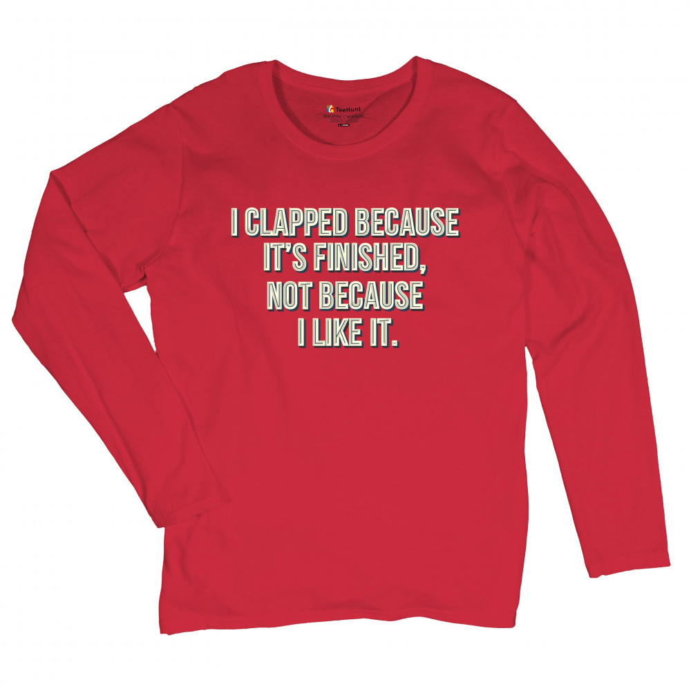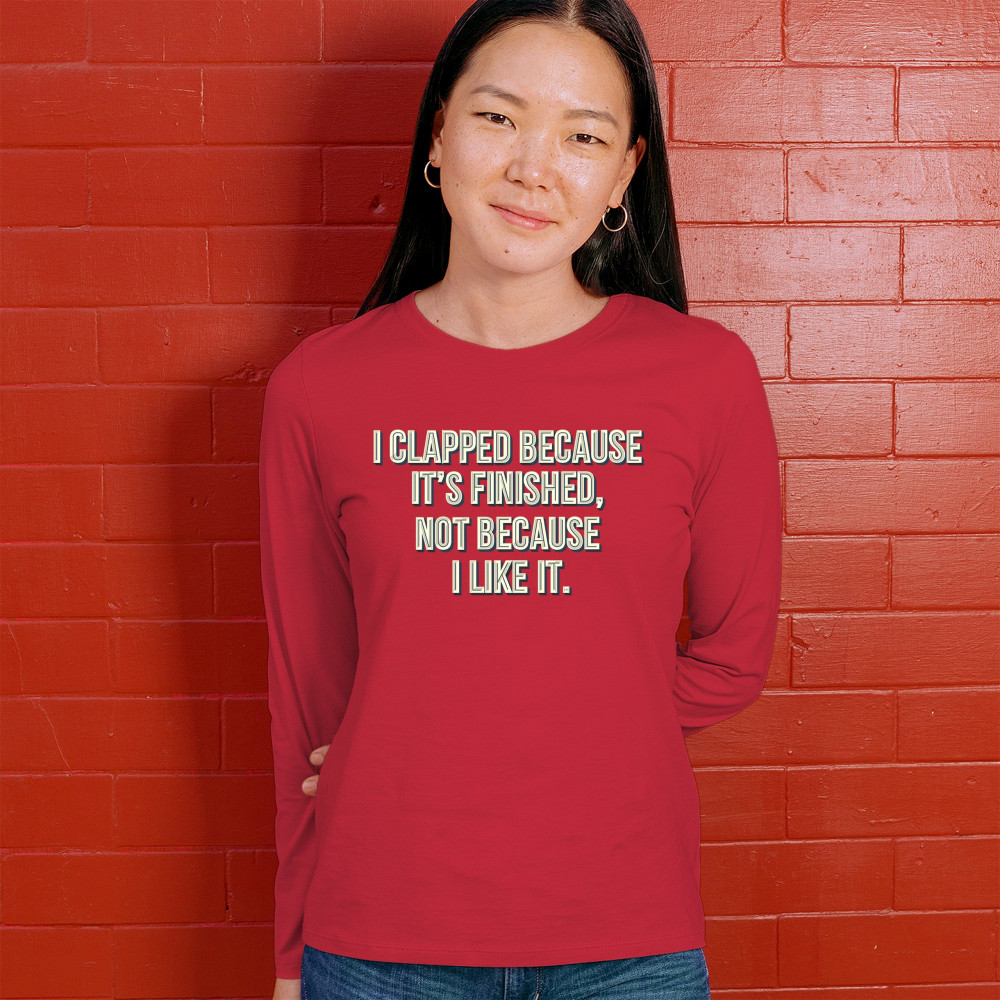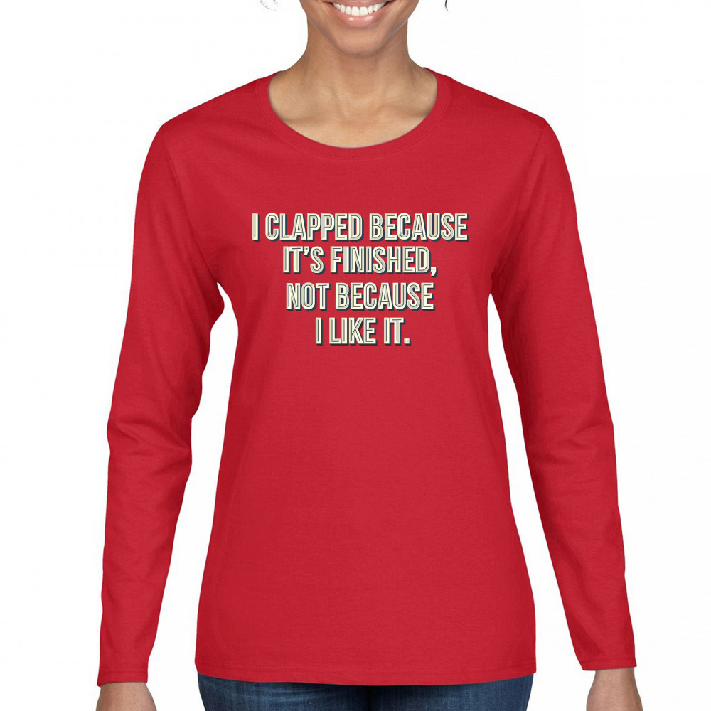 I CLAPPED BECAUSE IT'S FINISHED NOT BECAUSE I LIKE IT i clapped because it's finished sarcastic women's long sleeve t-shirt funny red