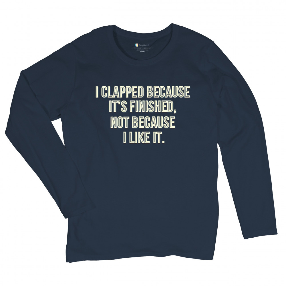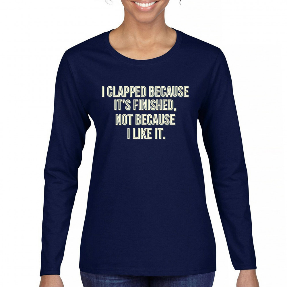 I CLAPPED BECAUSE IT'S FINISHED NOT BECAUSE I LIKE IT i clapped because it's finished sarcastic women's long sleeve t-shirt funny navy blue