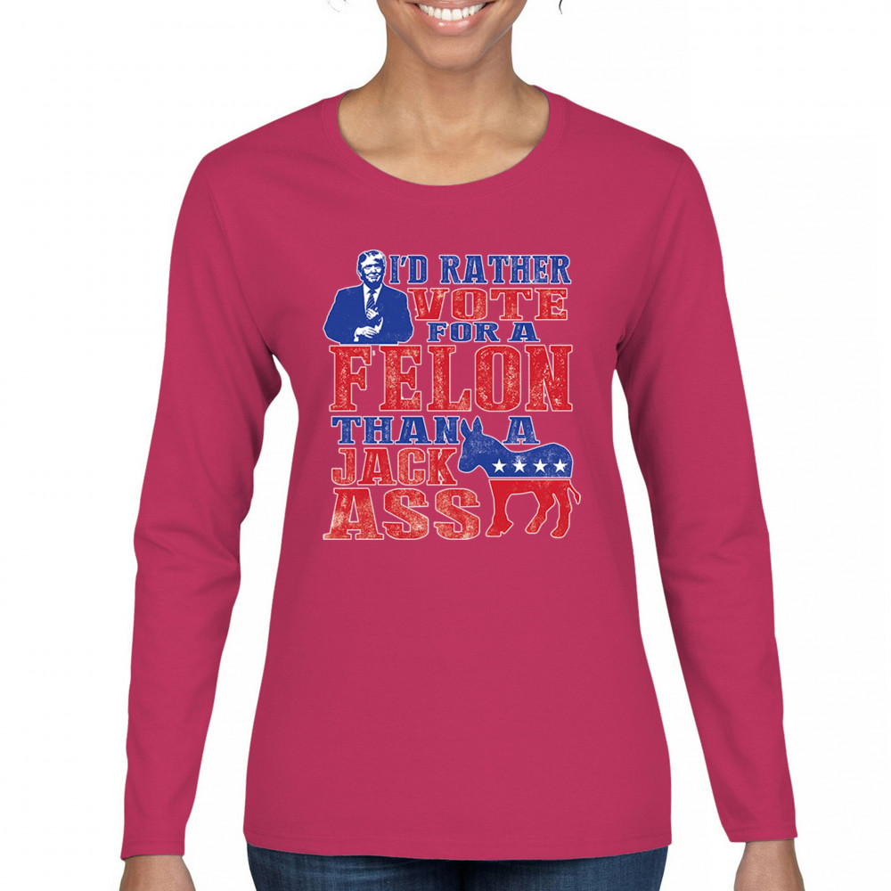 Boldly express your support with the "I'd Rather Vote For A Felon Than A Jackass" design. Perfect for rallies, it showcases loyalty to Trump and JD Vance.