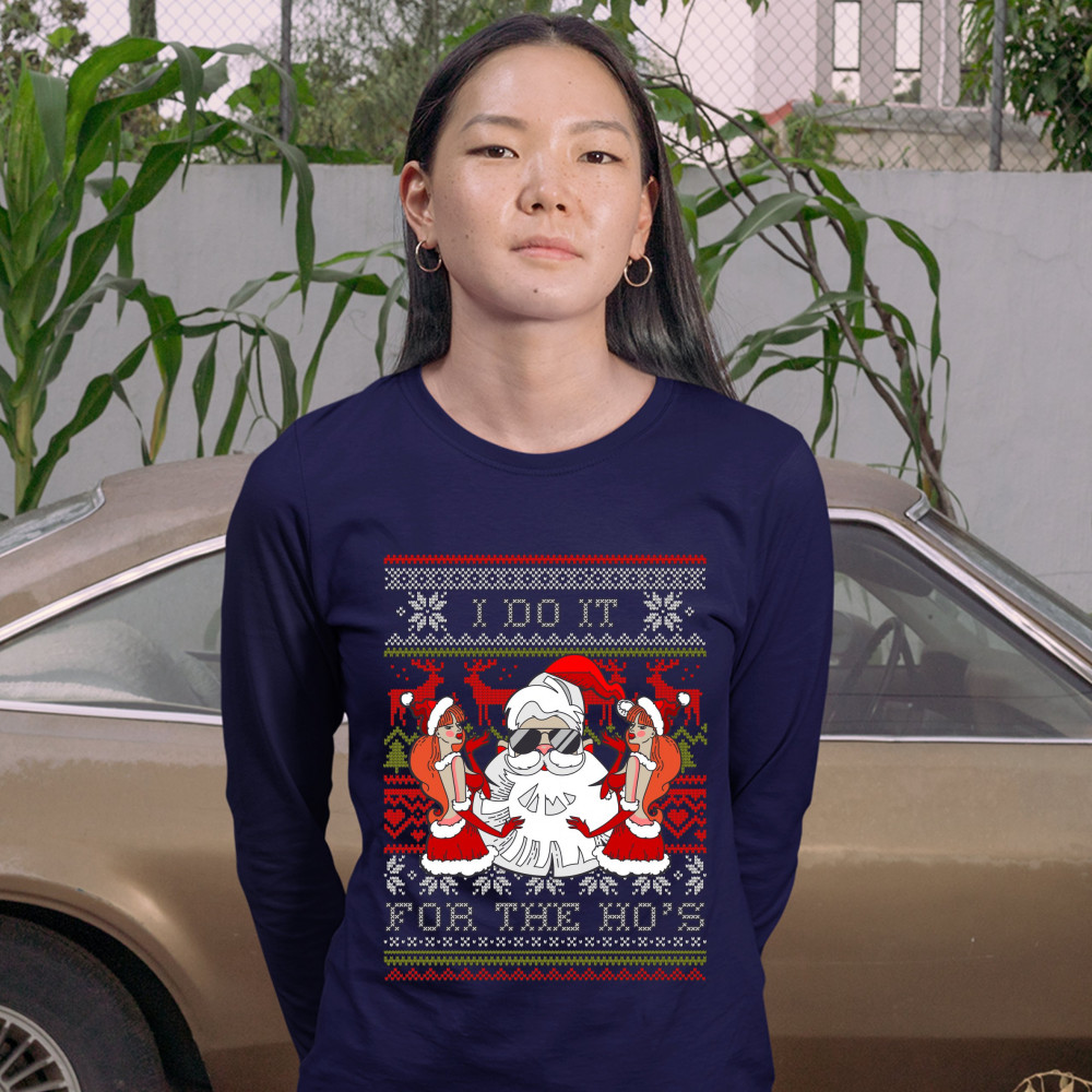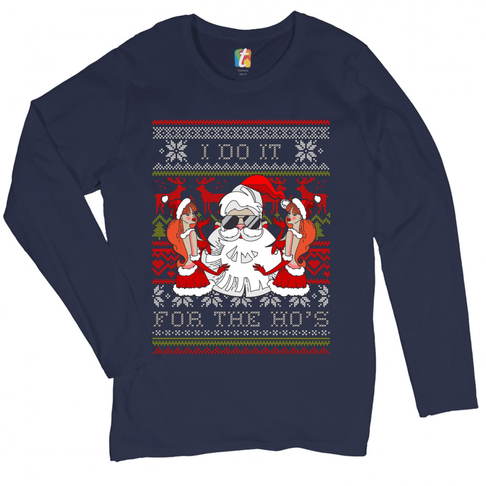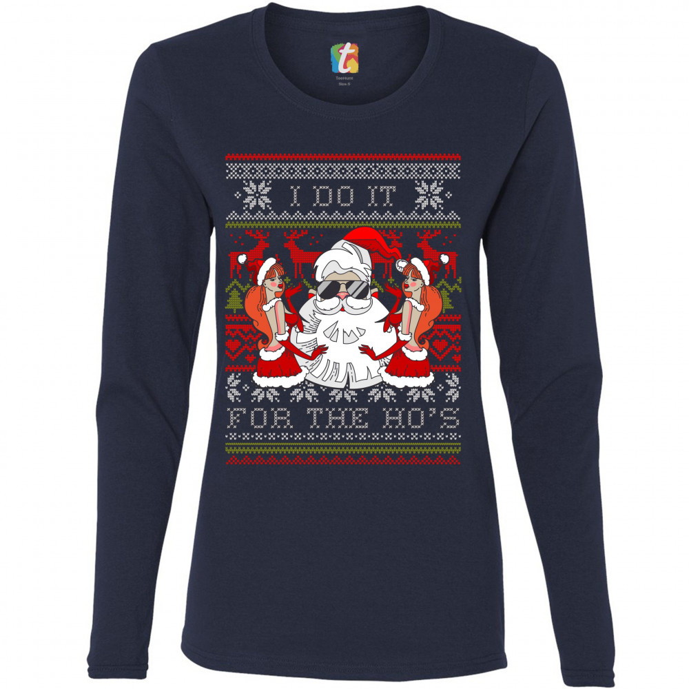 I DO IT FOR THE HO'S women's long sleeve t-shirt ugly sweater naughty santa navy blue